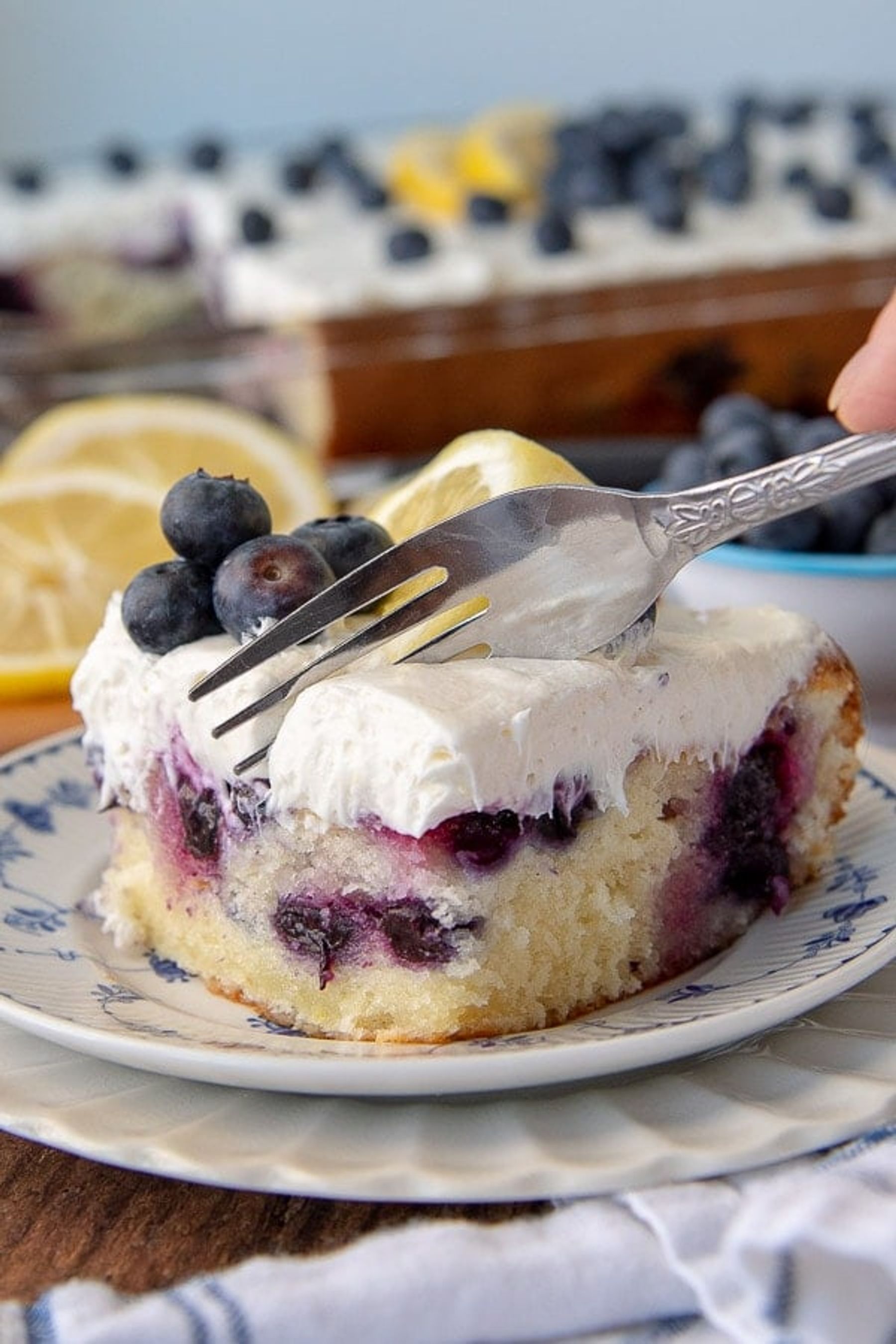Lemon Blueberry Cake recipe has a lemon glaze soaked into a sheet cake and topped with cream cheese frosting. Make from scratch or using a cake mix.