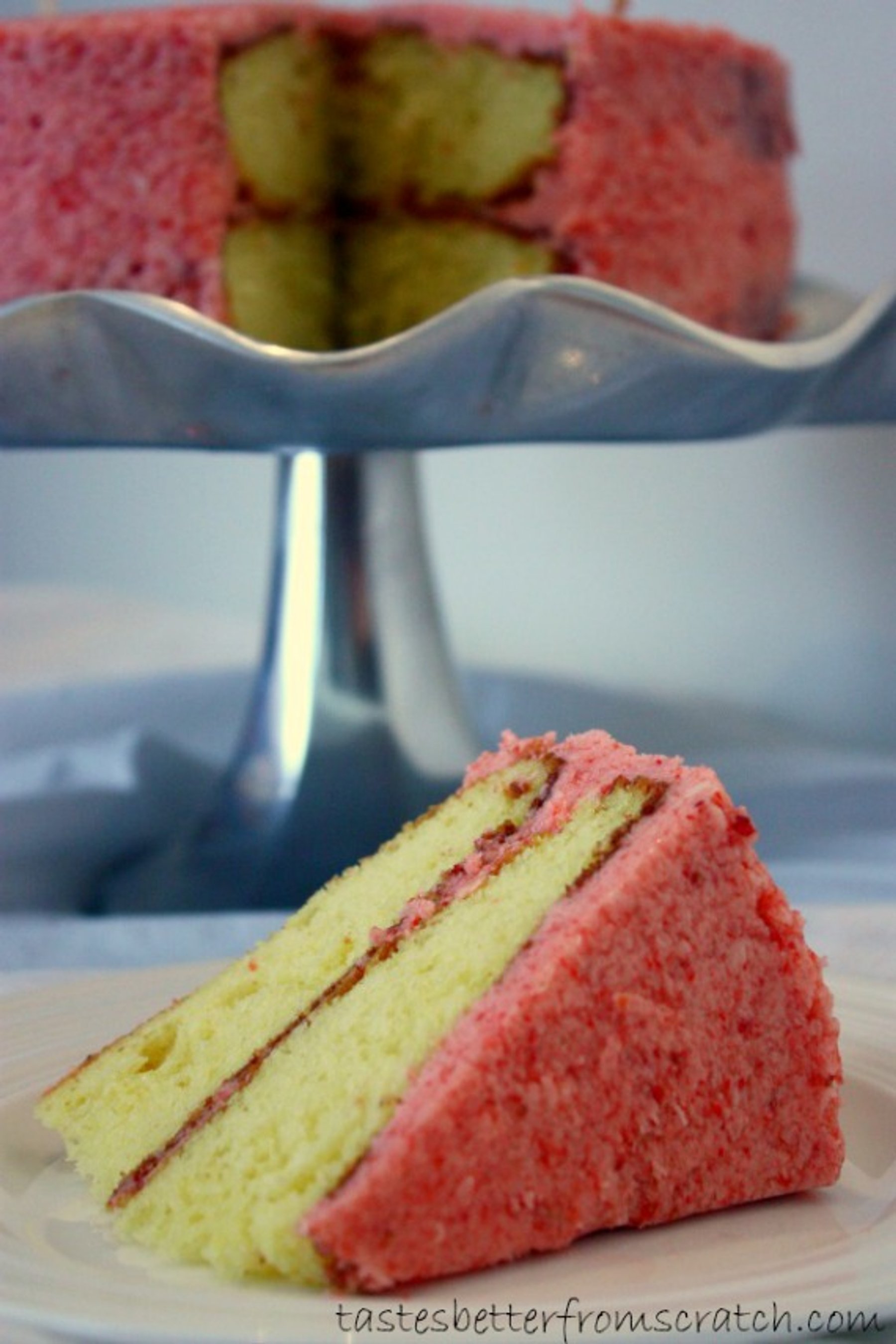 The best part about this cake, aside from the fluffy, moist and delicious lemon cake, is the fresh strawberry puree in the buttercream frosting!