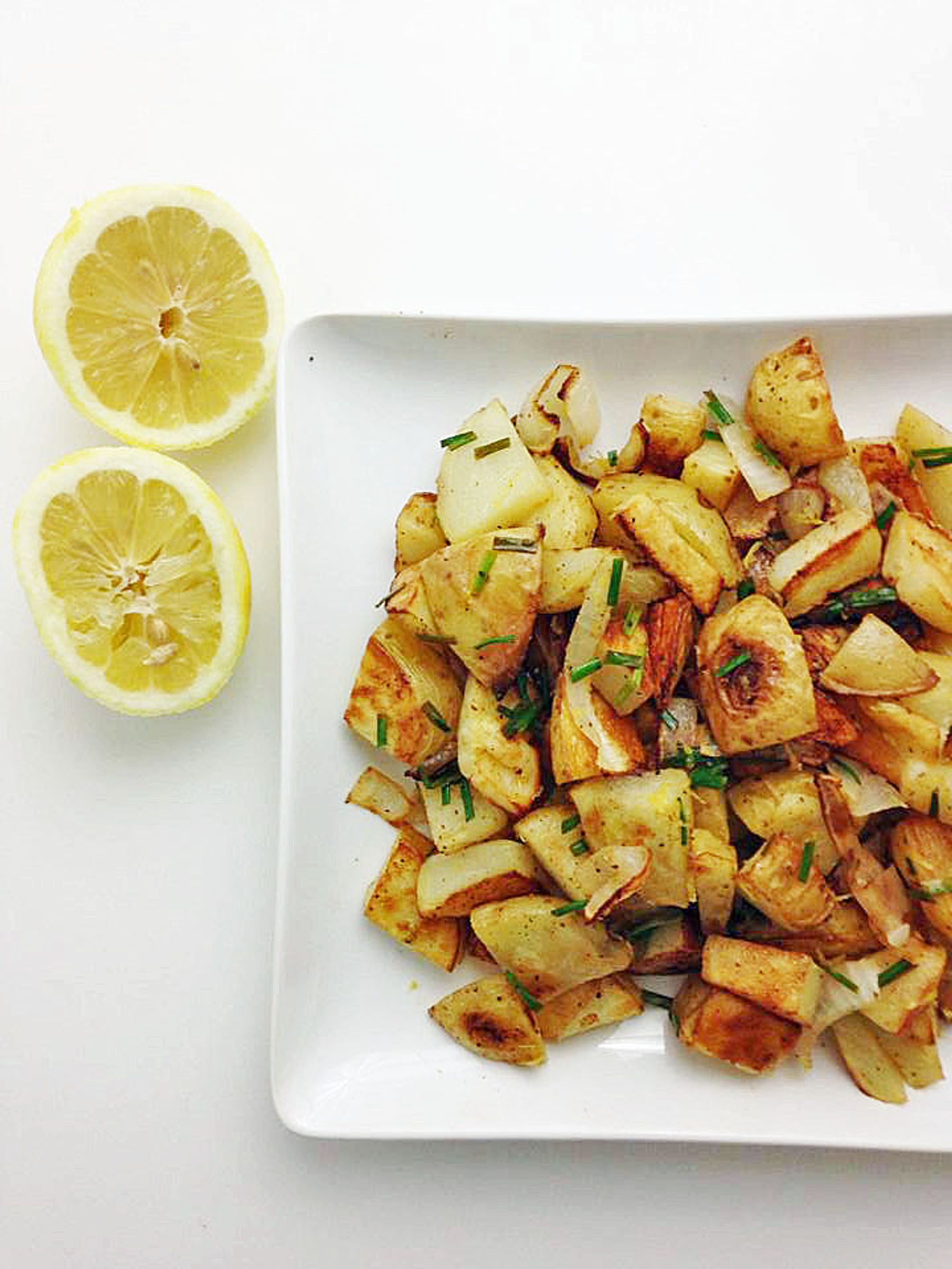 Preheat the oven to 425 degrees Fahrenheit. Spray a baking sheet with olive oil cooking spray. Dice the potatoes into ½ inch wide, bite sized pieces.Toss the potatoes with olive oil an lemon juice.