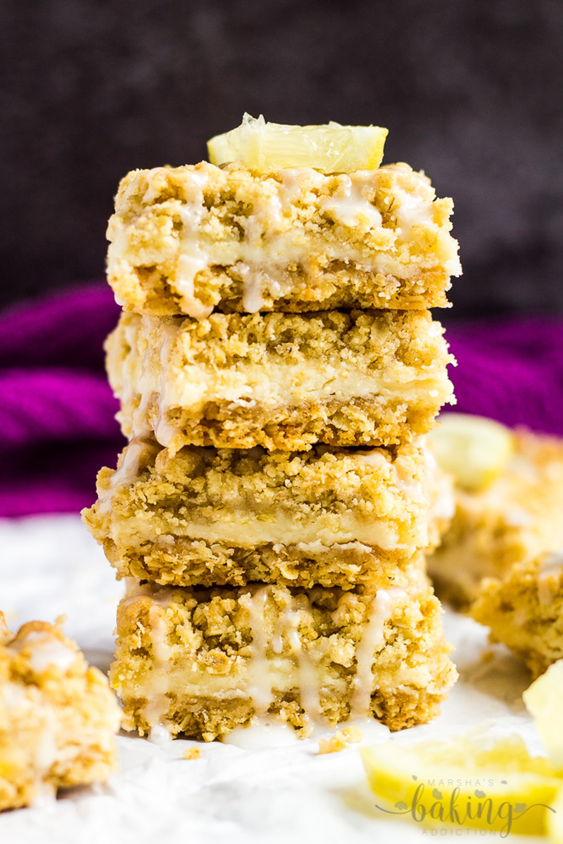 Deliciously buttery crumb bars stuffed with a zesty lemon cream filling, and drizzled with a sweet glaze!