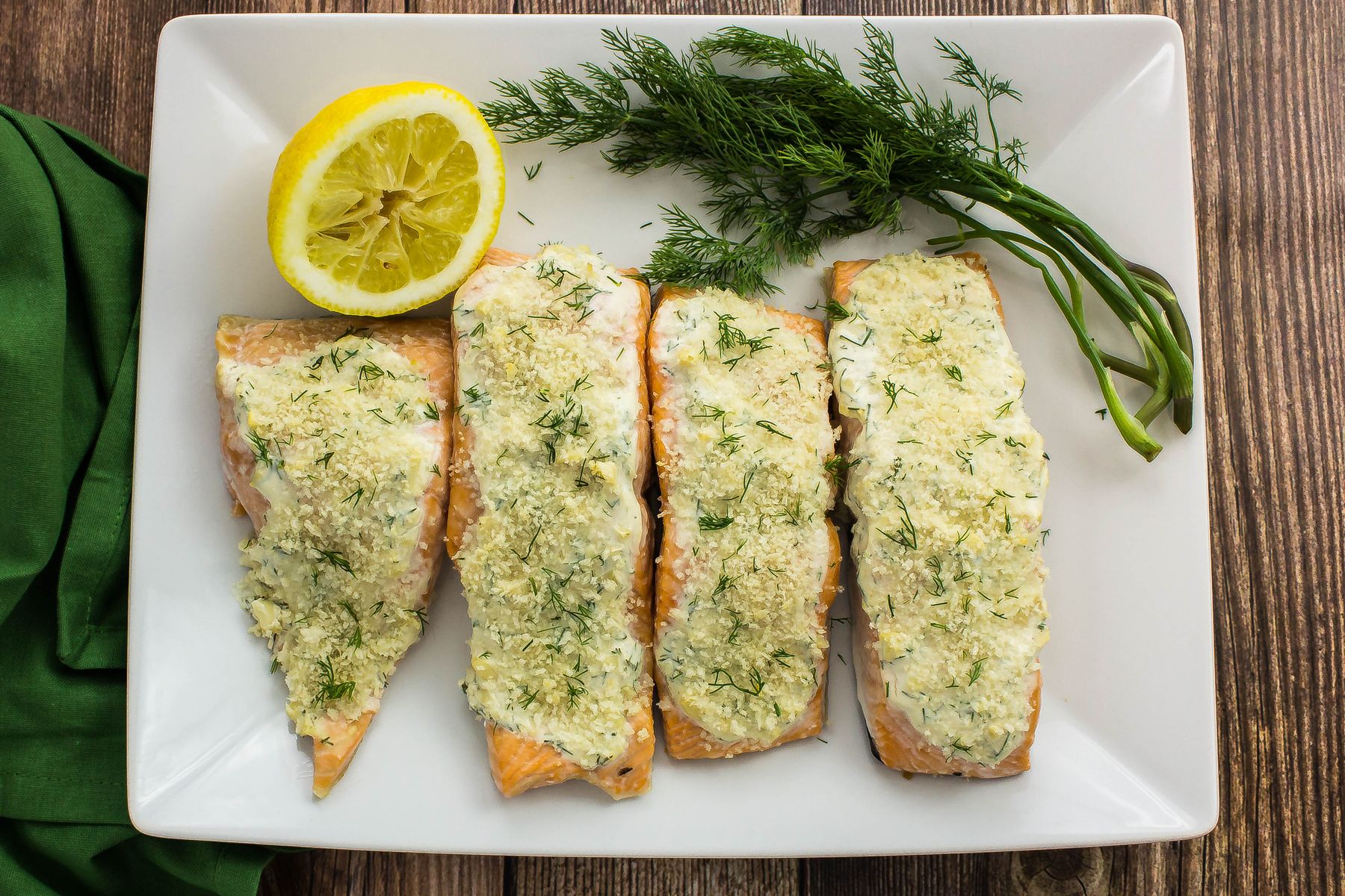 Lemon Dijon Crusted Salmon- Dijon mustard, dill, & yogurt spread over salmon, topped with panko. Quick to make & delicious with every bite. Weight Watchers friendly.