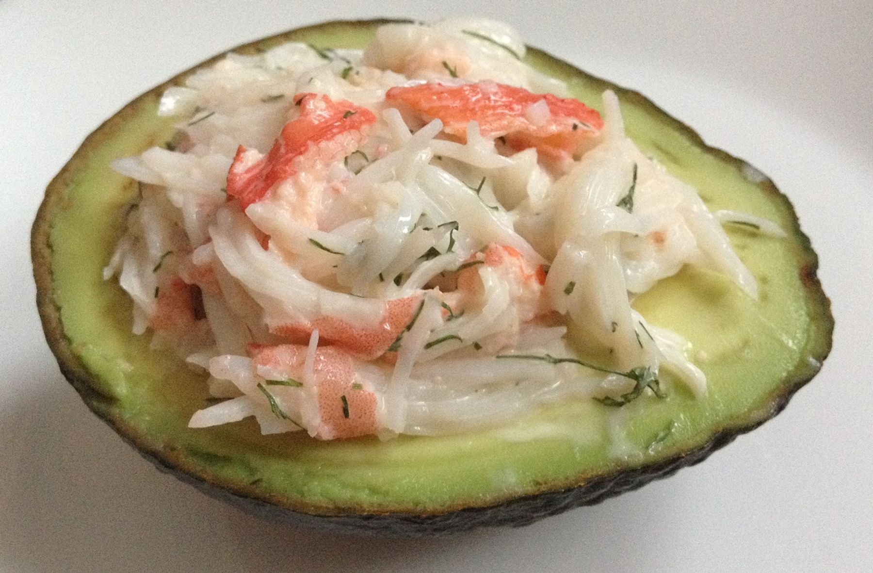 Divide the crab filling into two equal portions, and fill each avocado with one portion.