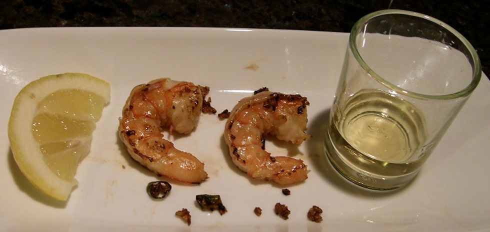 Place shrimps and lemon wedge on a serving plate, and serve with optional Tequila.