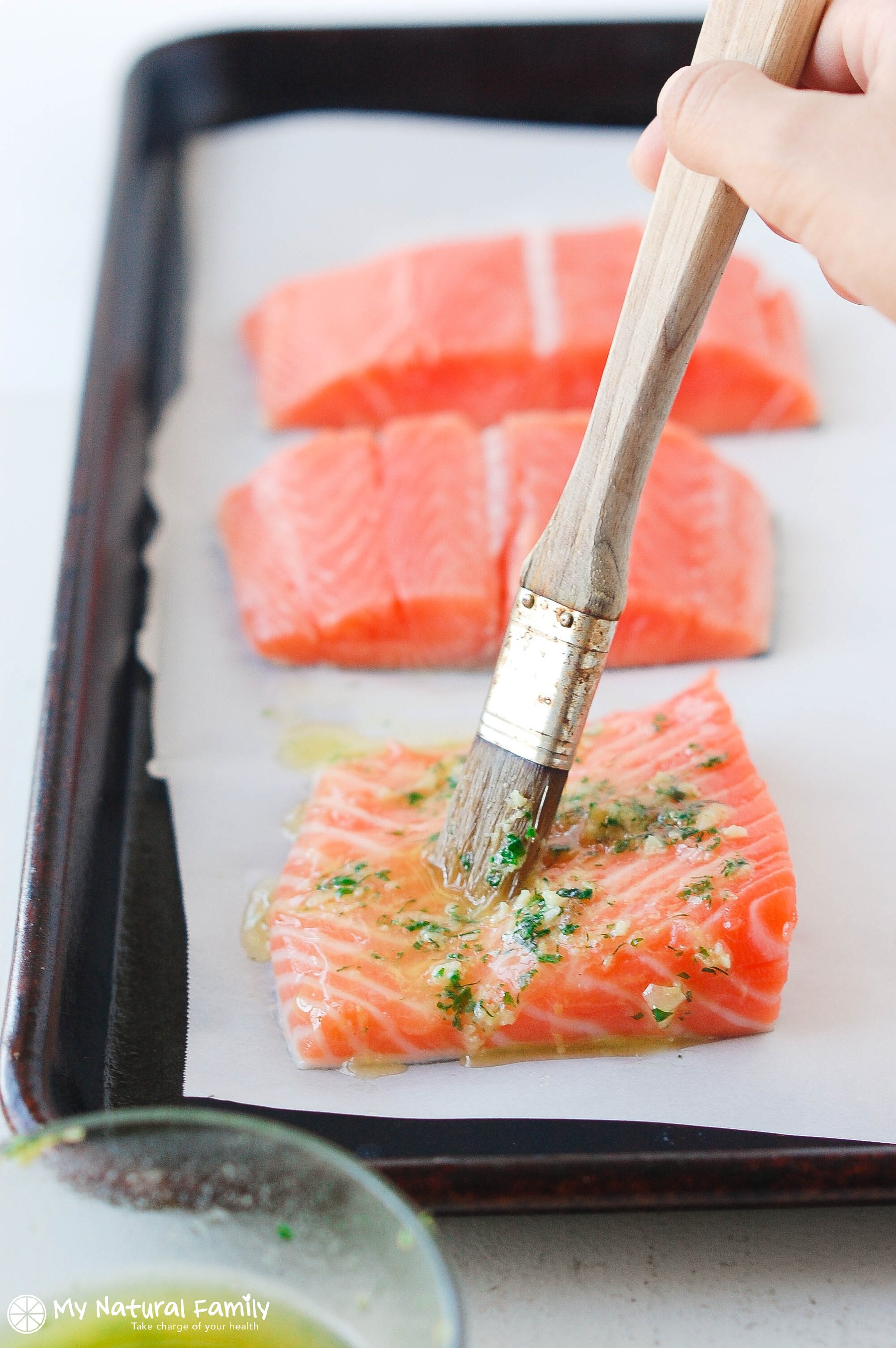 Place all ingredients except for salmon in a small bowl and melt in the microwave for 30-45 seconds. Stir until combined. Place the salmon fillets on a parchment lined baking sheet. Using a pastry brush,...