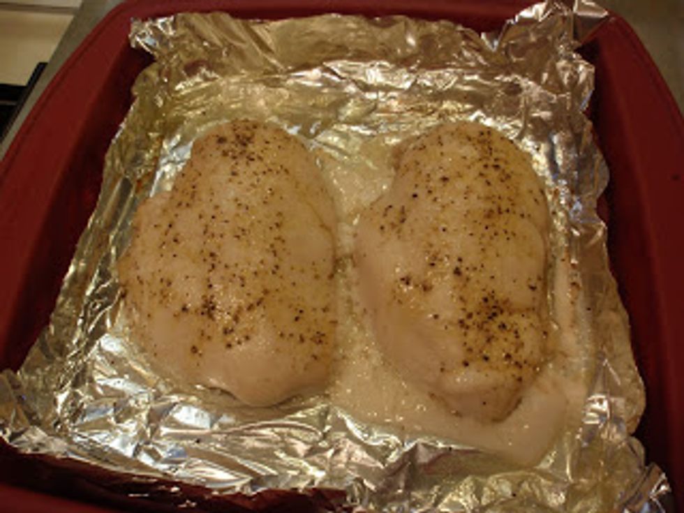 Line an 8x8 backing pan with tin foil. Melt the butter and using a basting brush, brush the butter onto both sides of the chicken breasts. Sprinkle with the lemon pepper seasoning. Bake at 350 for 30-40 minutes (halfway through, turn the breasts over and sprinkle the other side with seasoning) or until the chicken is cooked through - check with a meat thermometer, it should be at 180 degrees