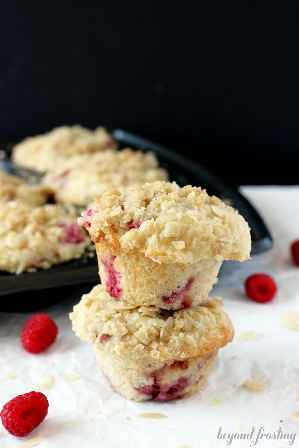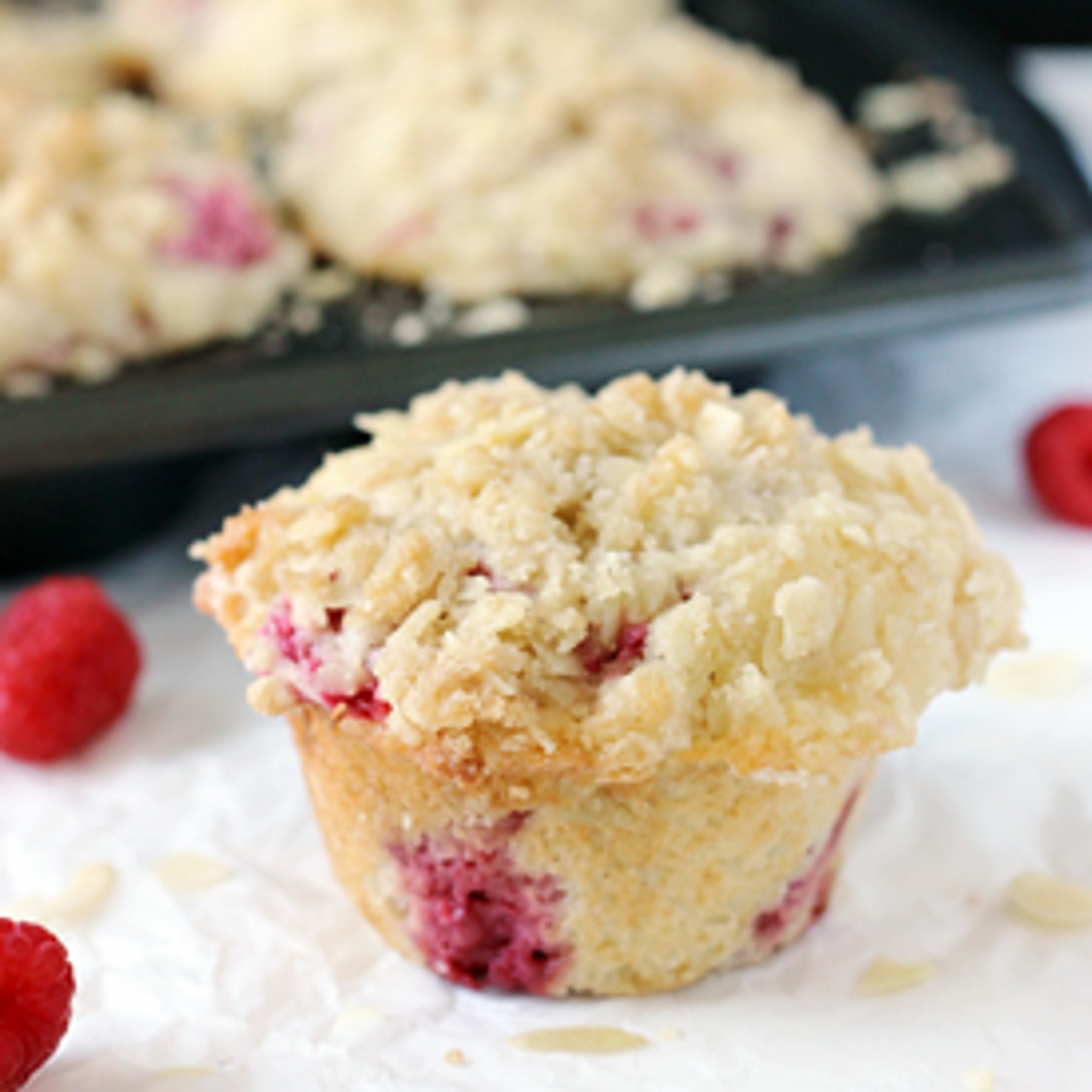 A lemon cupcake with fresh raspberry and an almond crumble.