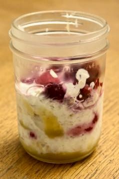 In a small bowl stir together the oats, coconut, milk and Greek yogurt.