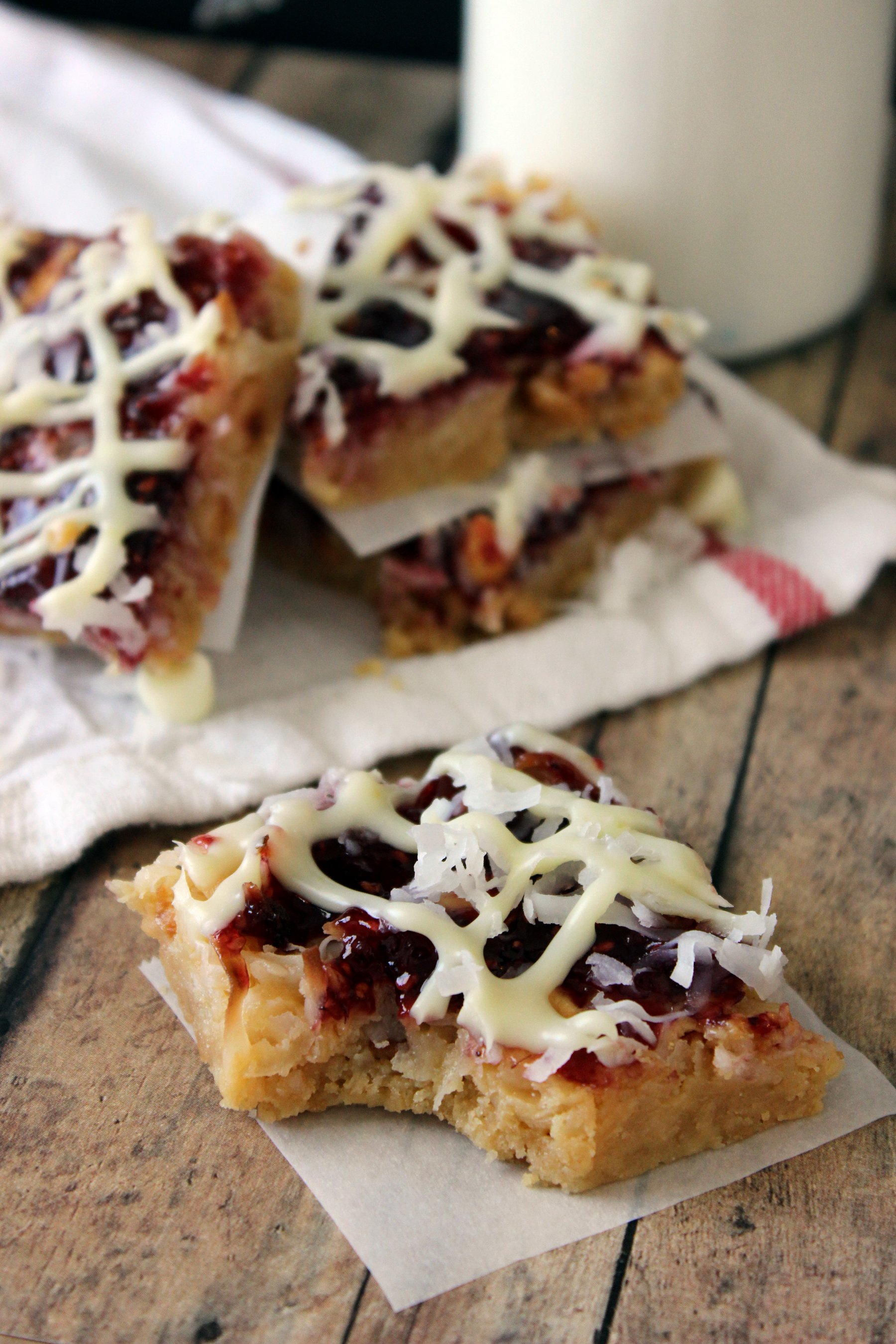 Lemoney shortbread cookie base with raspberry, coconut and white chocolate chips. Drizzled with a lemon infused white chocolate ganache.