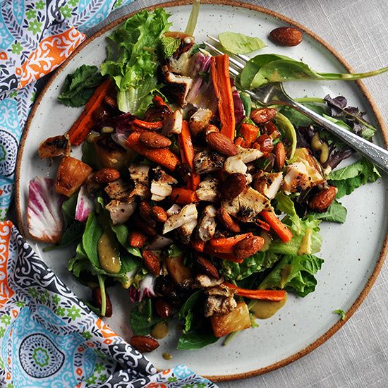 Grilled lemon rosemary chicken piled on a mountain of fresh greens dressed with rosemary honey tahini dressing, with roasted carrots and dates, grilled pineapple, and candied almonds.