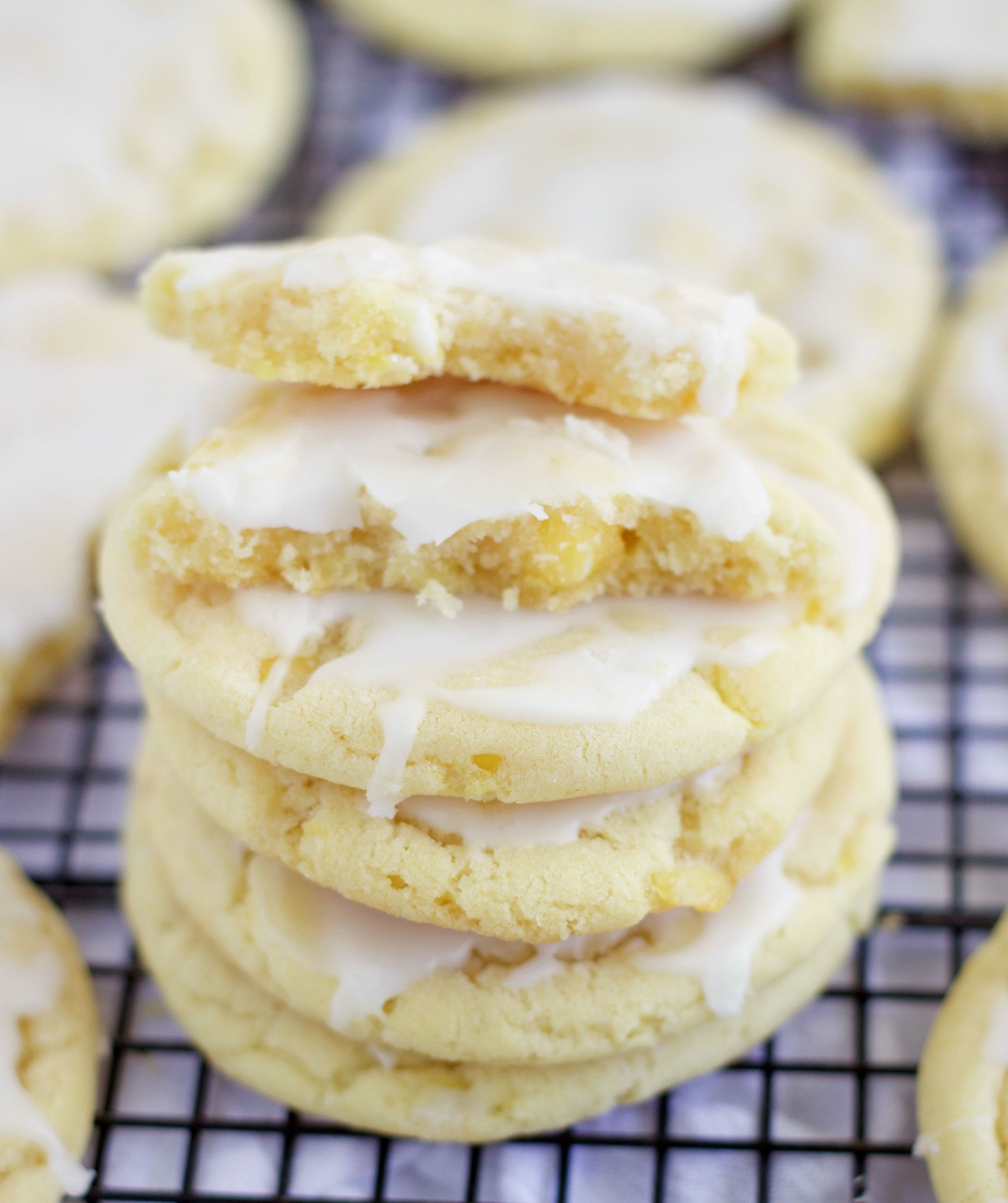 A soft, chewy cookie with crushed LemonHeads and topped with a lemon glaze.