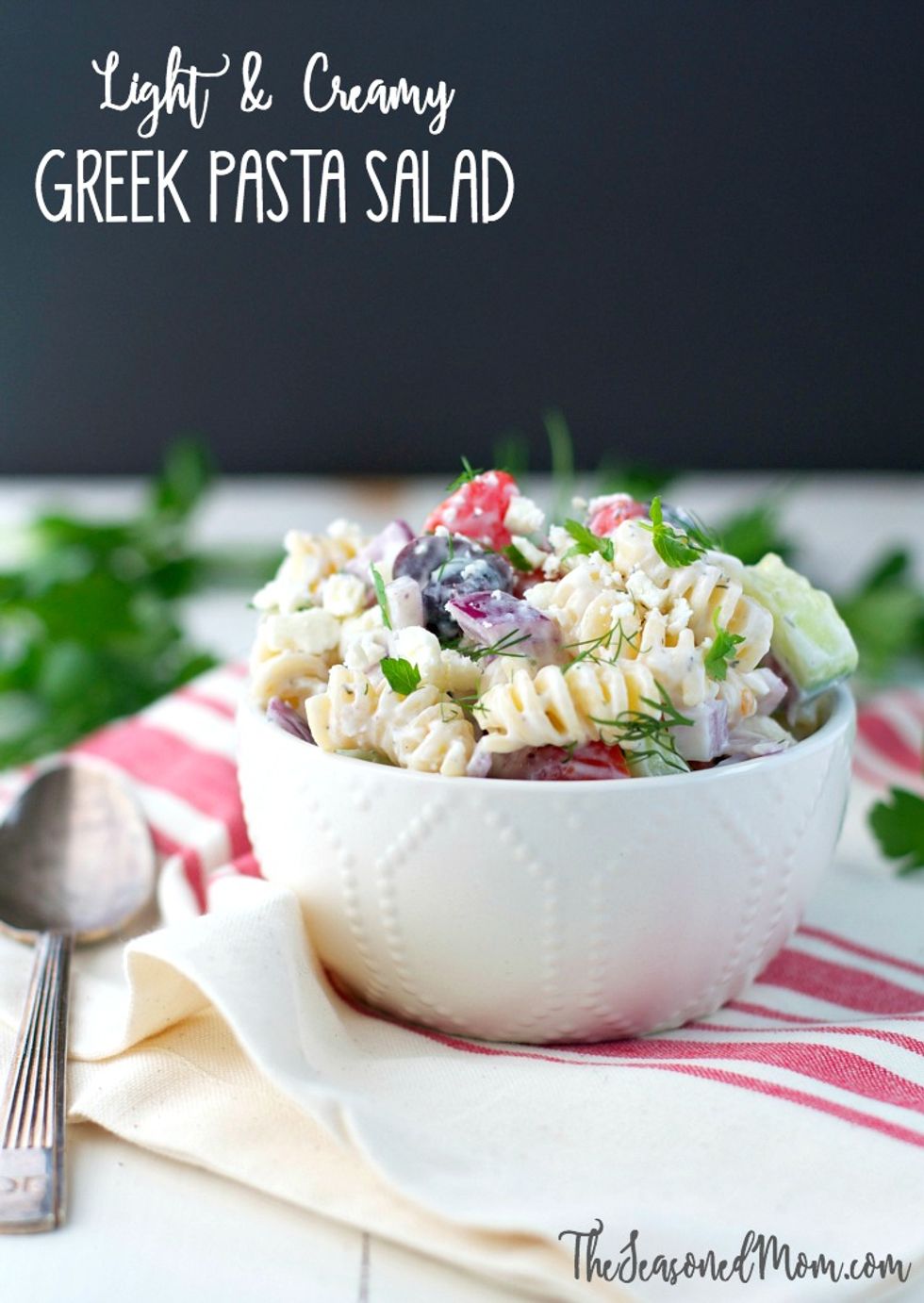 Loaded with fresh veggies, olives, artichoke hearts, and feta cheese and then dressed in a yogurt-based garlic and cucumber Tzatziki Sauce, this Light and Creamy Greek Pasta Salad is a flavorful side dish or vegetarian main course that’s perfect for picnics, potlucks, and make-ahead lunches this season! Best of all, the quick and easy recipe is ready in about 20 minutes!