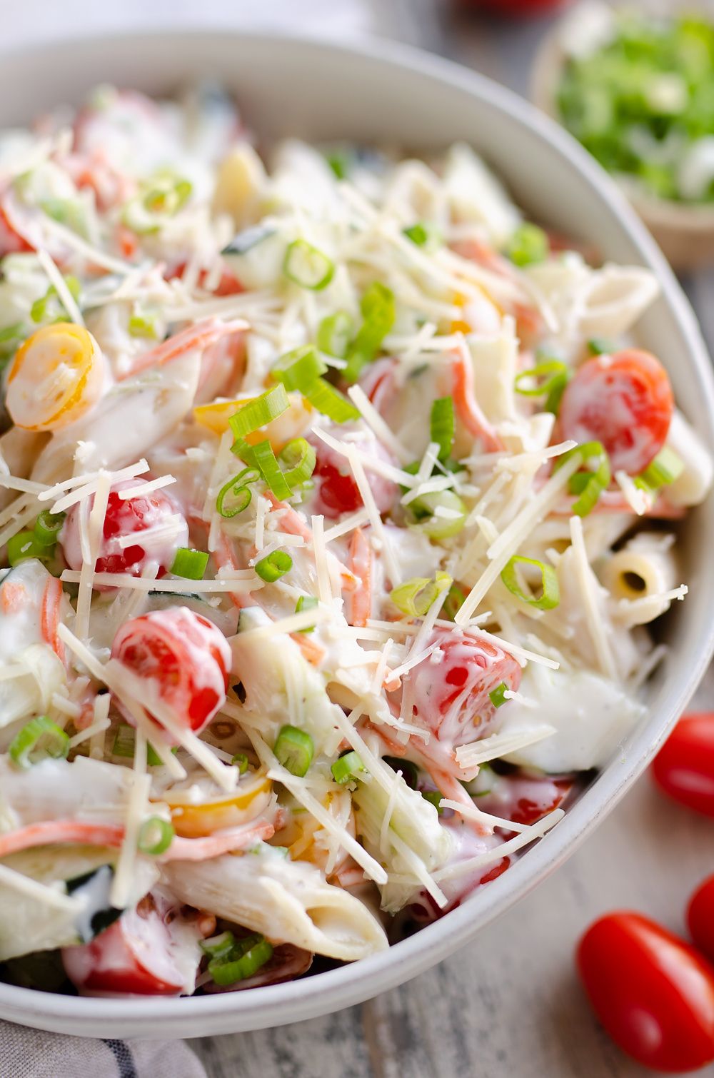 Light Parmesan Ranch Pasta Salad is an easy and simple side dish loaded with fresh vegetables and finished off with a Greek yogurt ranch dressing.