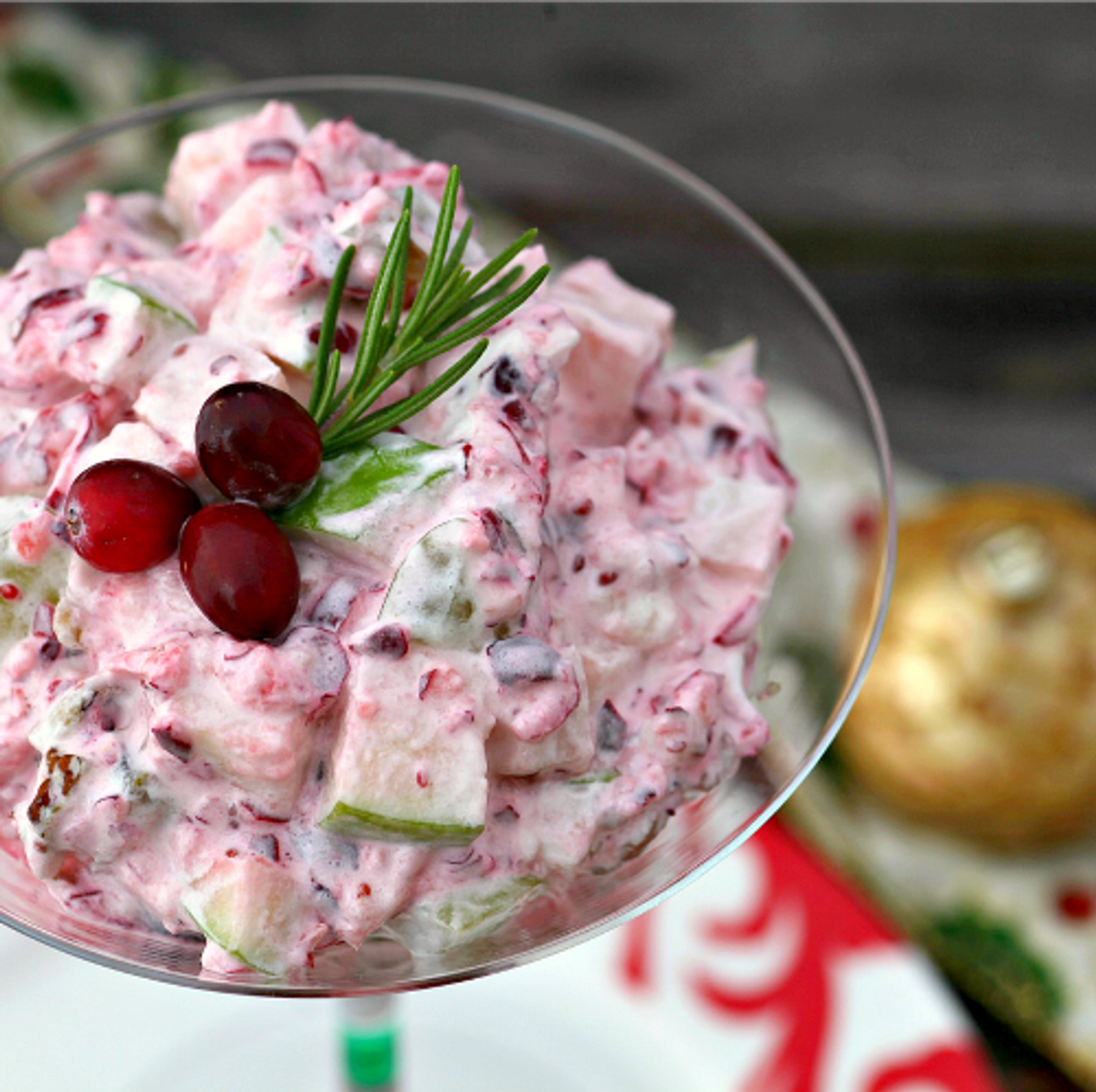 A family tradition - apples, cranberries and grapes mixed with marshmallows and cool whip. It's a light, sweet dish for Thanksgiving.