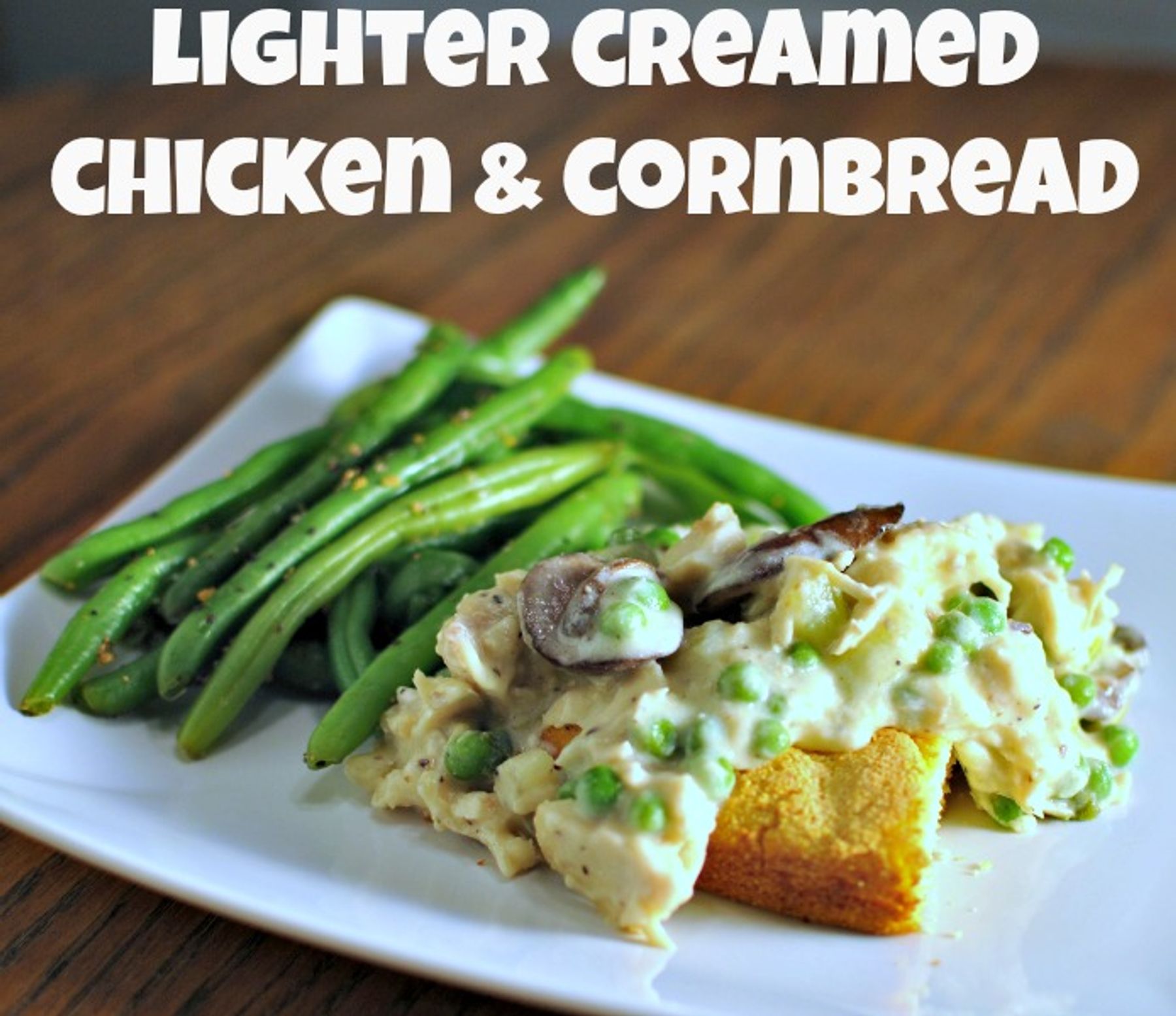 Lighter Creamed Chicken & Cornbread is a recipe make-over from a friend. The original recipe called for 8 TBSP of butter and heavy cream but we fixed that!