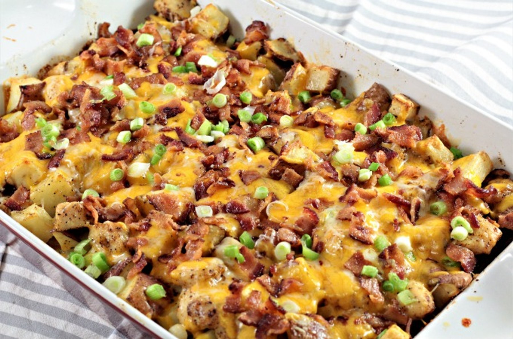 Chicken and potatoes tossed with olive oil and seasonings, then topped with bacon, scallions, and melted cheese. So easy!