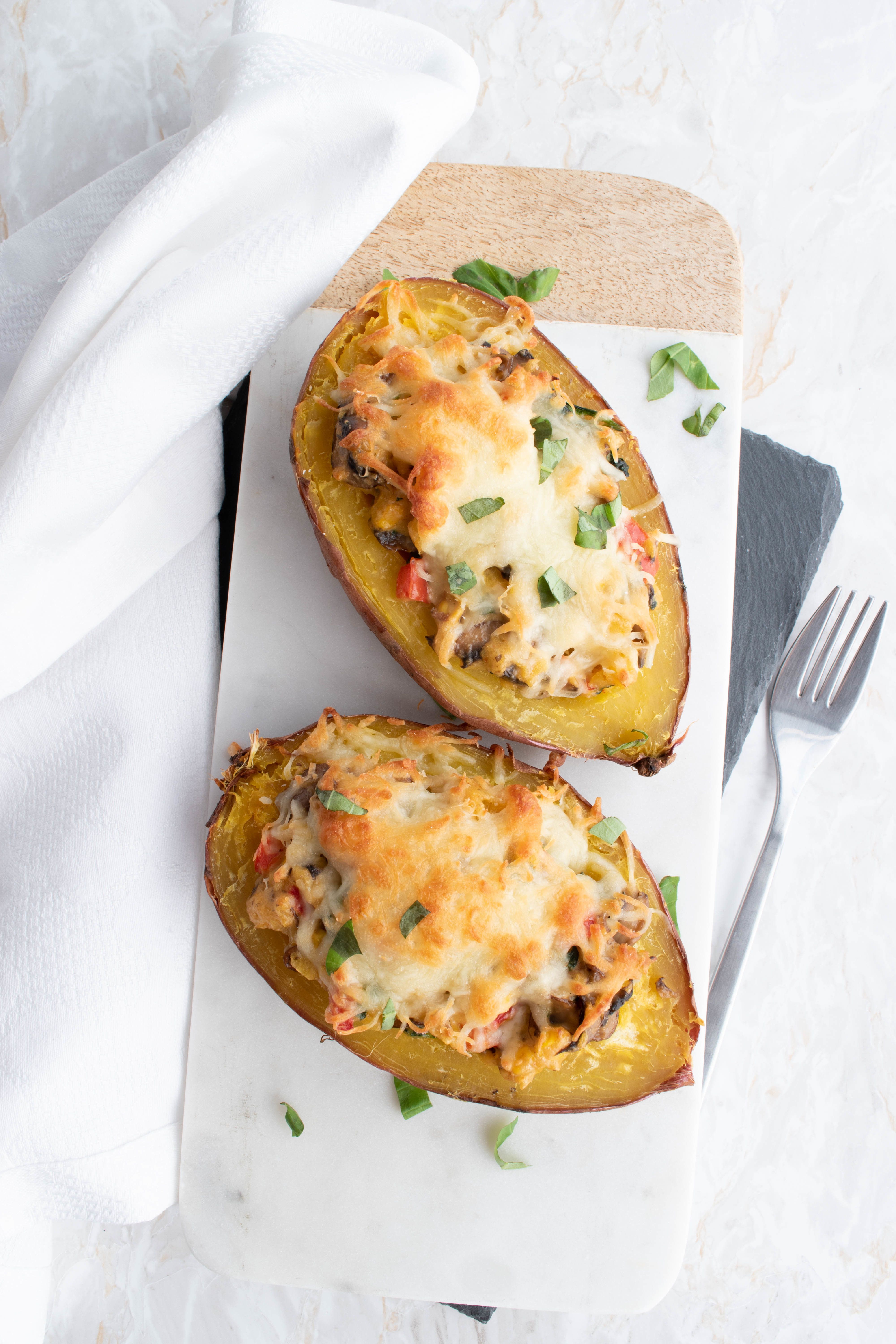 Baked sweet potatoes with creamy stuffing made from sautéed veggies, cream cheese and melted mozzarella on top. This is the ultimate comfort food dish that is going to make you come back for more. It's super indulgent yet, it's super healthy. These loaded sweet potatoes will blow you away.
