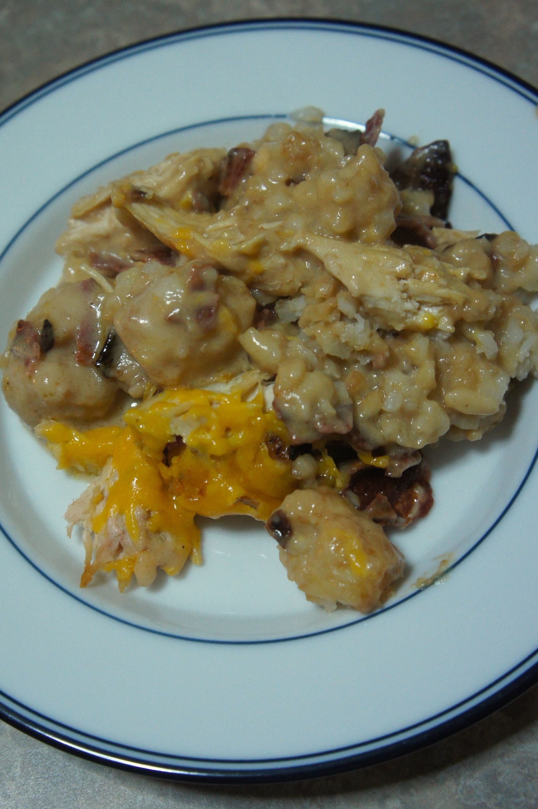Place tater tots in the bottom of a 9x13 baking dish and bake for 20 minutes.