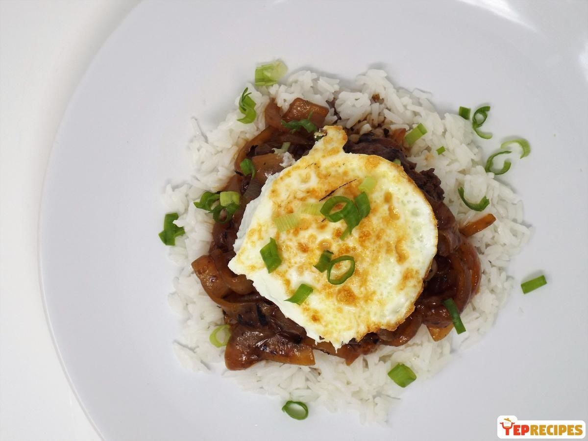 A Hawaiian dish consisting of a beef patty topped with a caramelized onion sauce over a bed of steamed rice and topped with a fried egg.