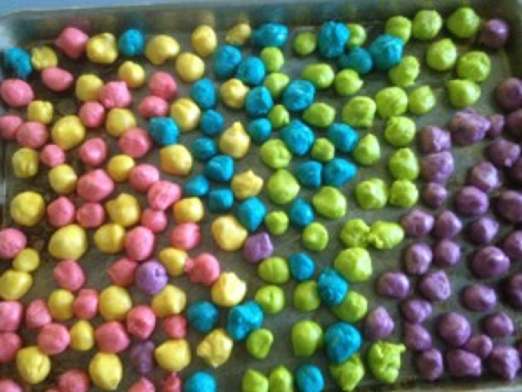 2. Divide your dough into 5 small bowls and add five different liquid food colors. The colors will dull some after they bake so make them bright!
