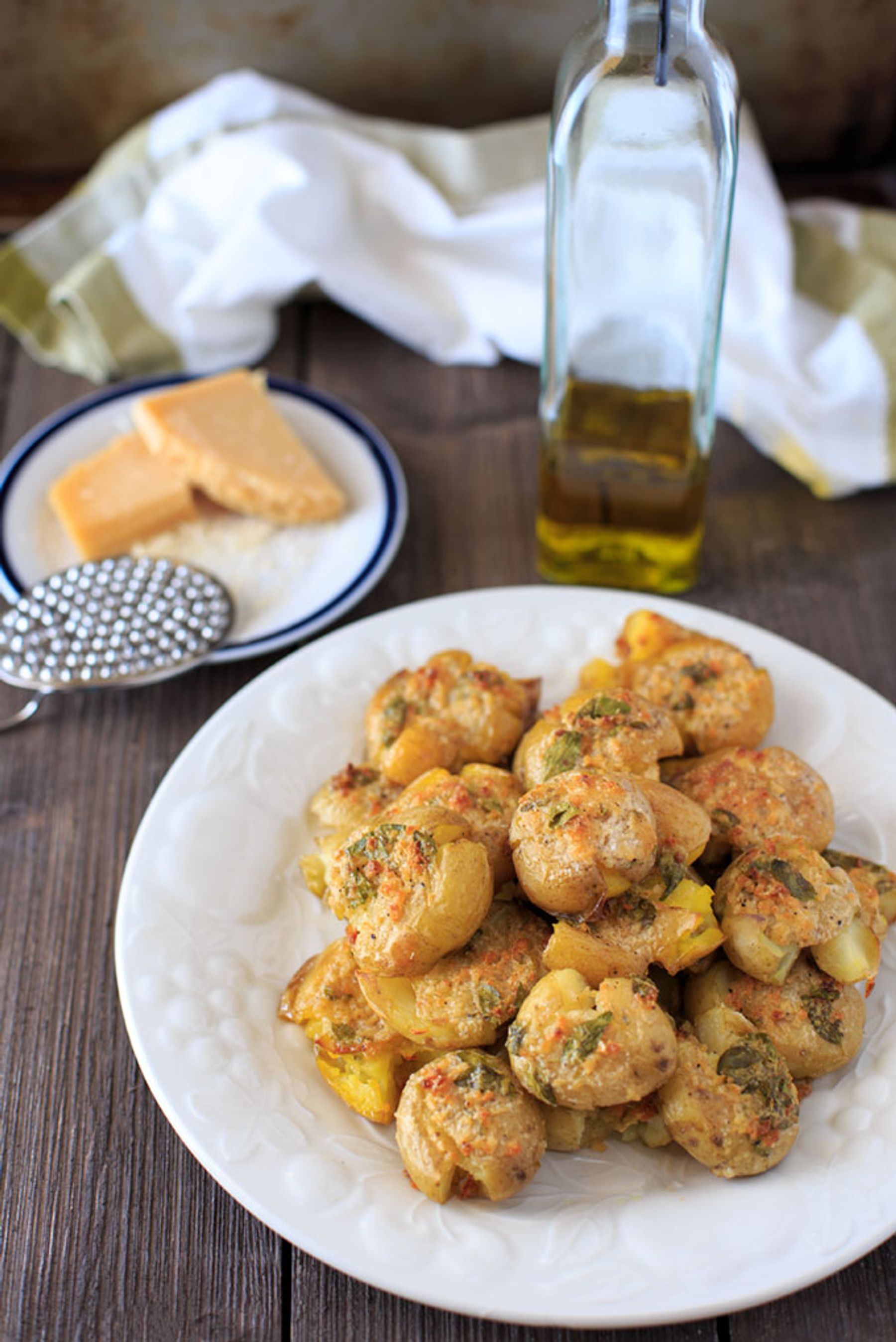 These smashed potatoes really appeal to my Mediterranean-loving taste buds. Crispy and savory outside, tender and sweet inside.