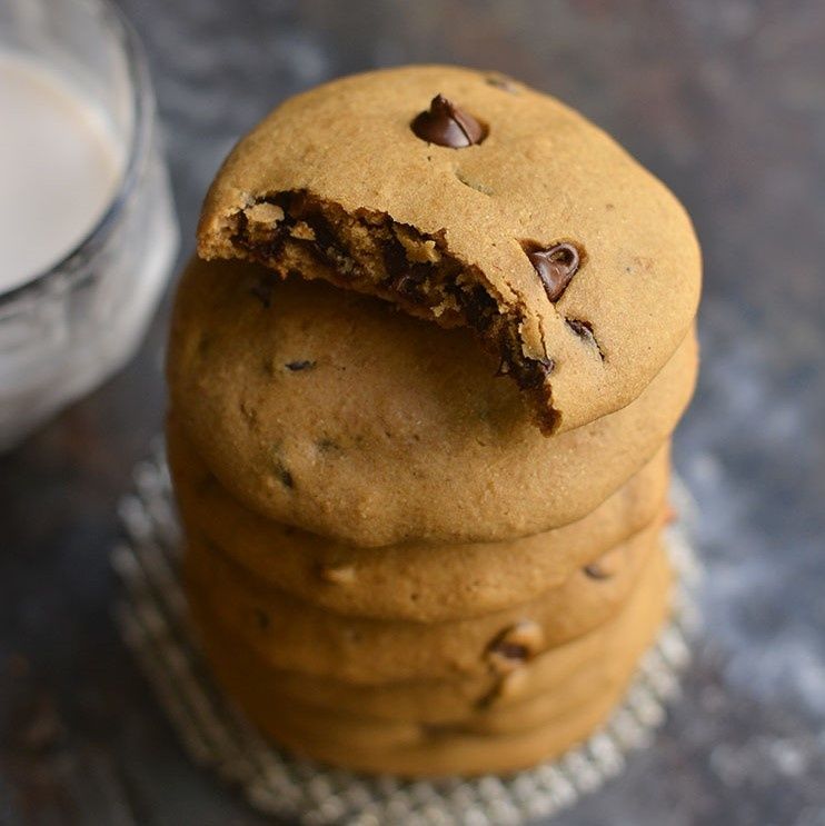 Low Calorie Gluten Free Chocolate Chip Cookies! Perfectly soft baked cookies made with real food ingredients! A healthier version of a childhood favorite made without any refined oil or sugar. Gluten Free + Low Calorie