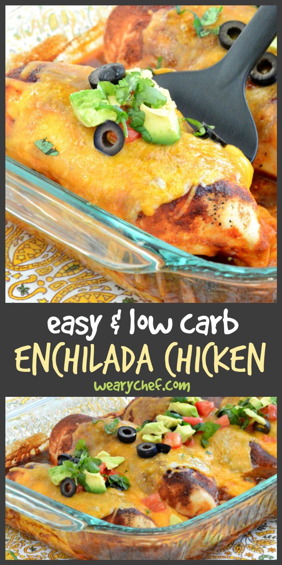 Enjoy the flavor of enchiladas the easy and low carb way with this simple Enchilada Chicken Bake recipe!
