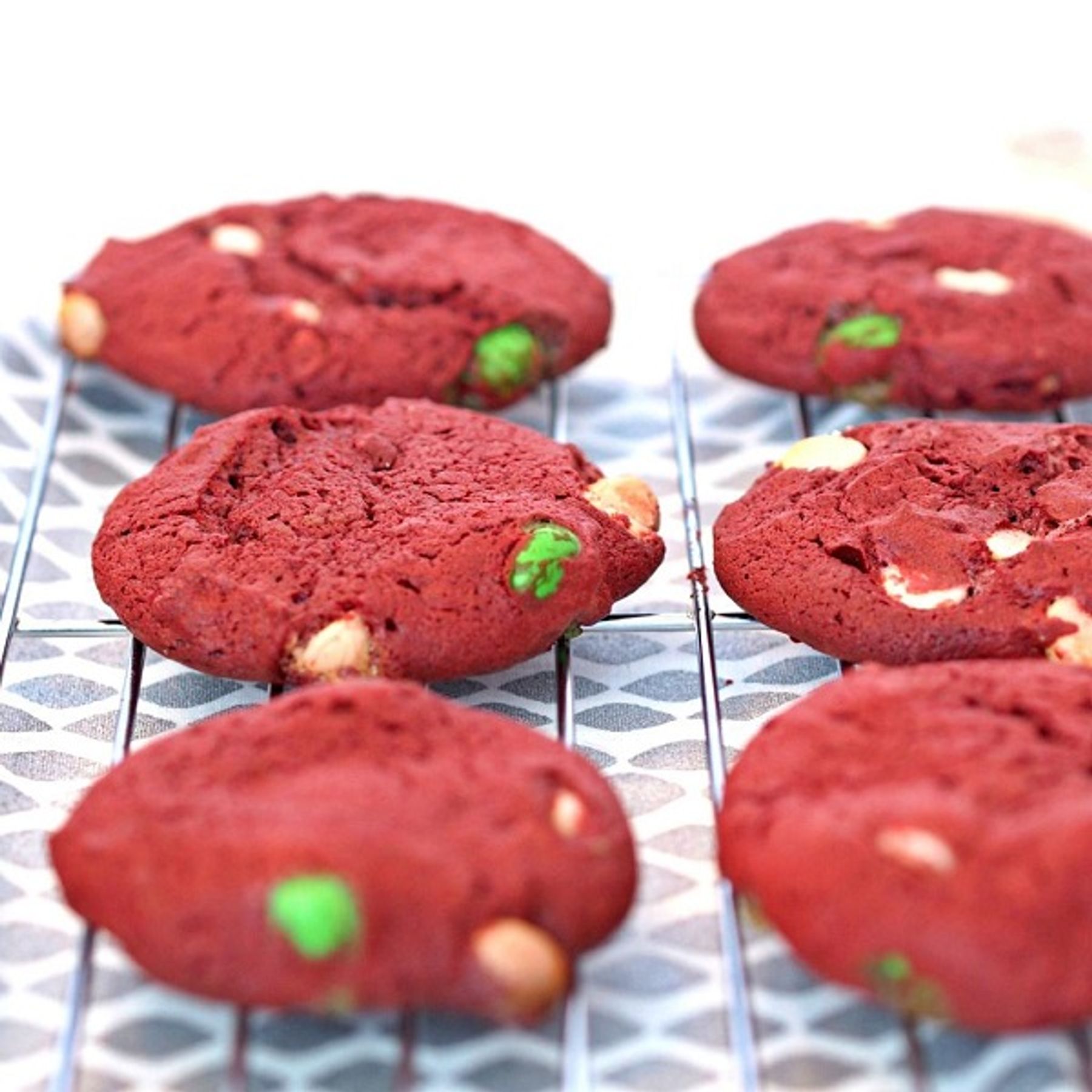 M&M Red Velvet Cake Cookies! Made with cake mix. Easy and perfect for Christmas!