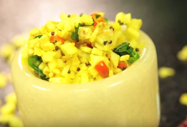 1. In a bowl, mix chopped mango ginger, chillies, salt, turmeric, lime juice.