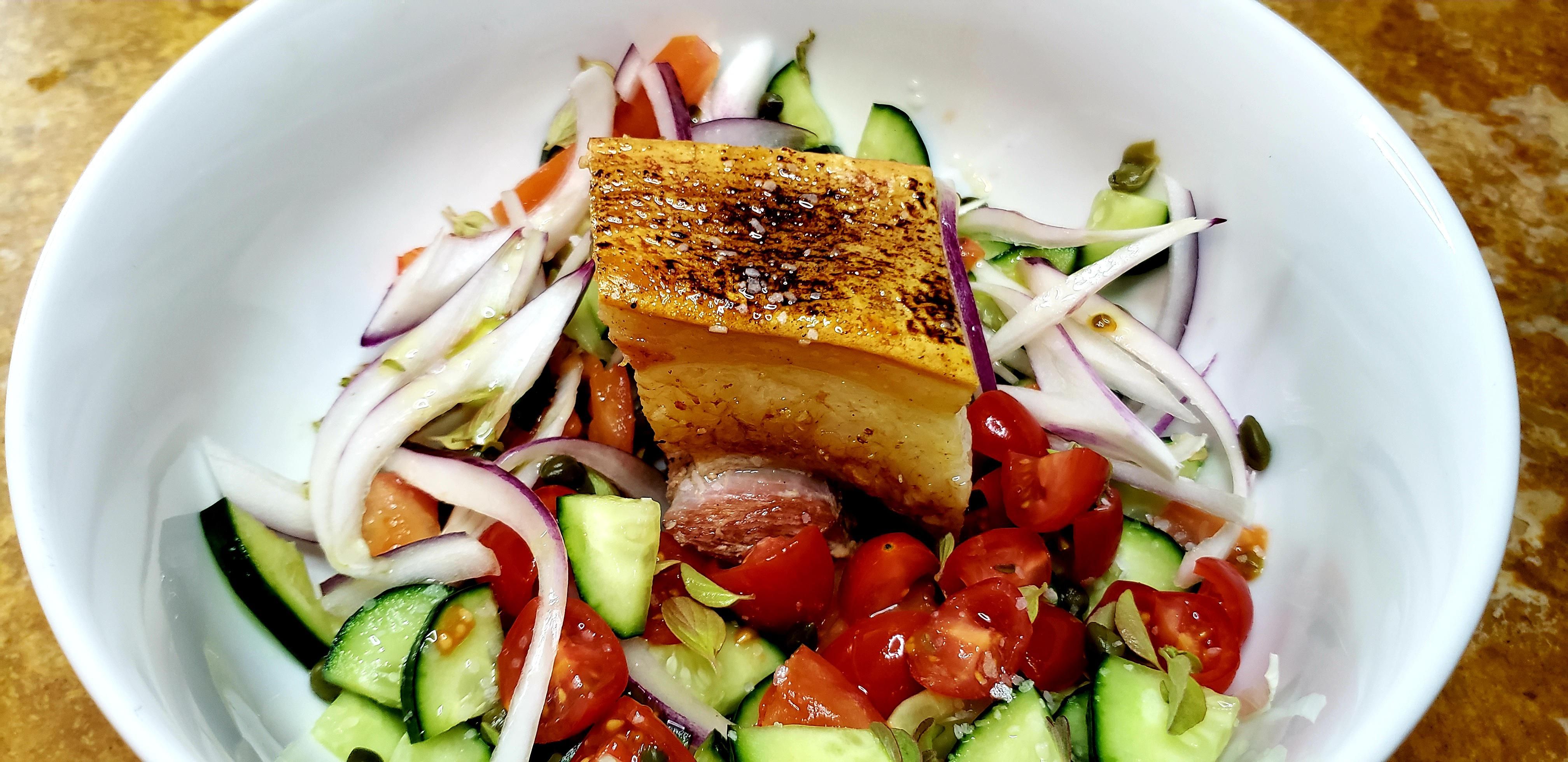 - Place pork into pan. Make sure the skin and fat is above the liquid.