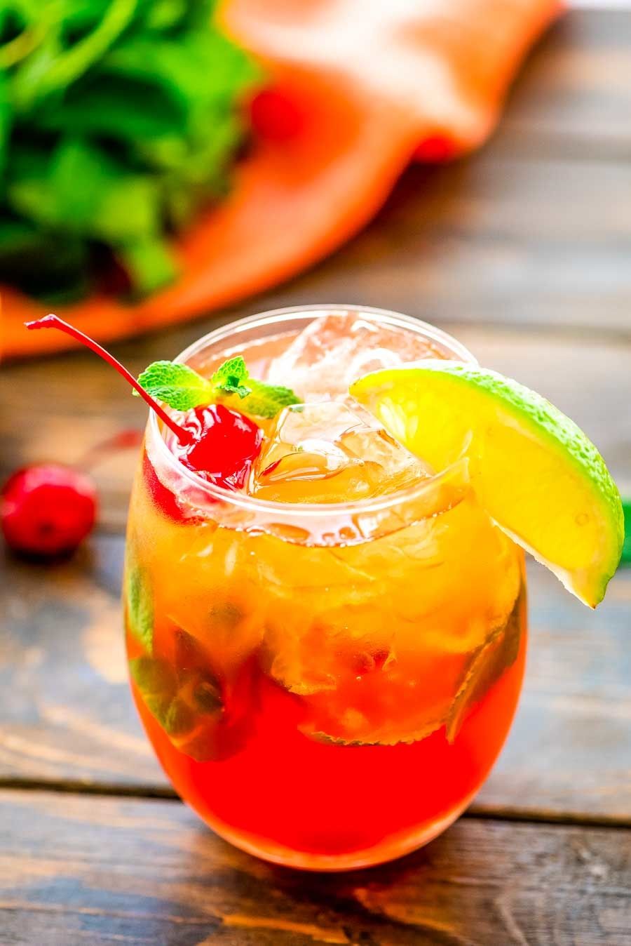 Mai Tai is a delicious, refreshing Tiki cocktail based on rum, Curacao liqueur, orgeat syrup and lime juice. It's finished off with a splash of grenadine, and served with a mint sprig, maraschino cherry and lime. This is going to be your new favorite fruity cocktail recipe when entertaining or relaxing.