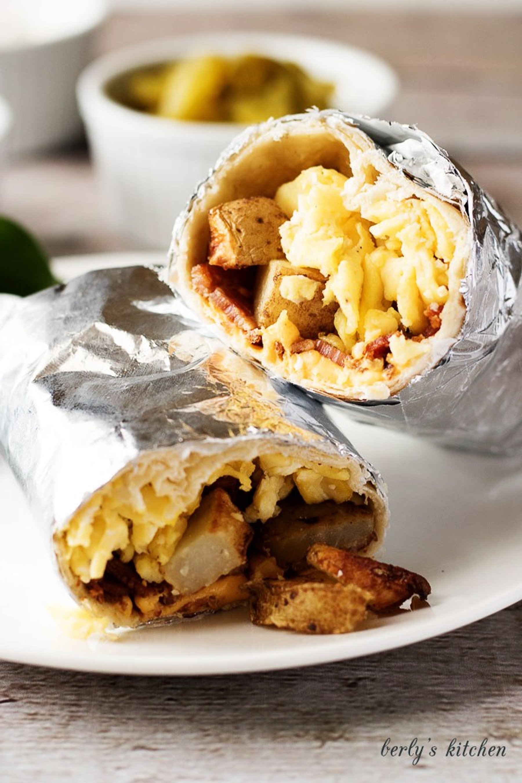 Main Dishes Make Ahead Breakfast Burritos Kimberly VargoJuly 17, 2017 67 A hearty and filling make ahead breakfast burrito recipe with bacon, eggs, potatoes, and cheese wrapped in a warm tortilla.2http://www.berlyskitchen.com/make-ahead-breakfast-burritos/See the full directions on my site