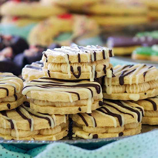 Tender little shortbread cookies flavored with white chocolate and malted milk powder are filled with a rich halva buttercream and drizzled with white and dark chocolate.