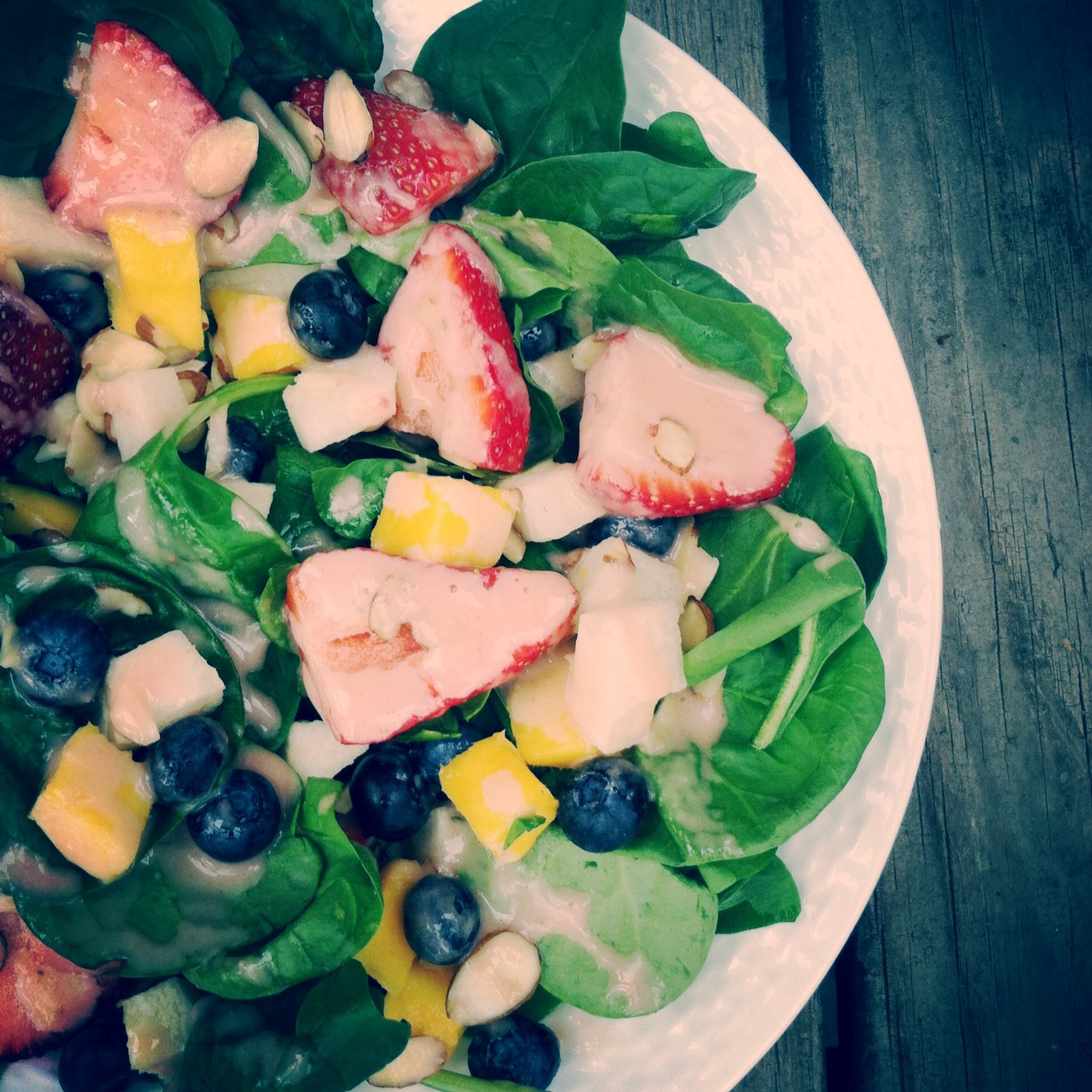 Mango Berry Spinach Salad with Strawberry Lemon Vinaigrette
