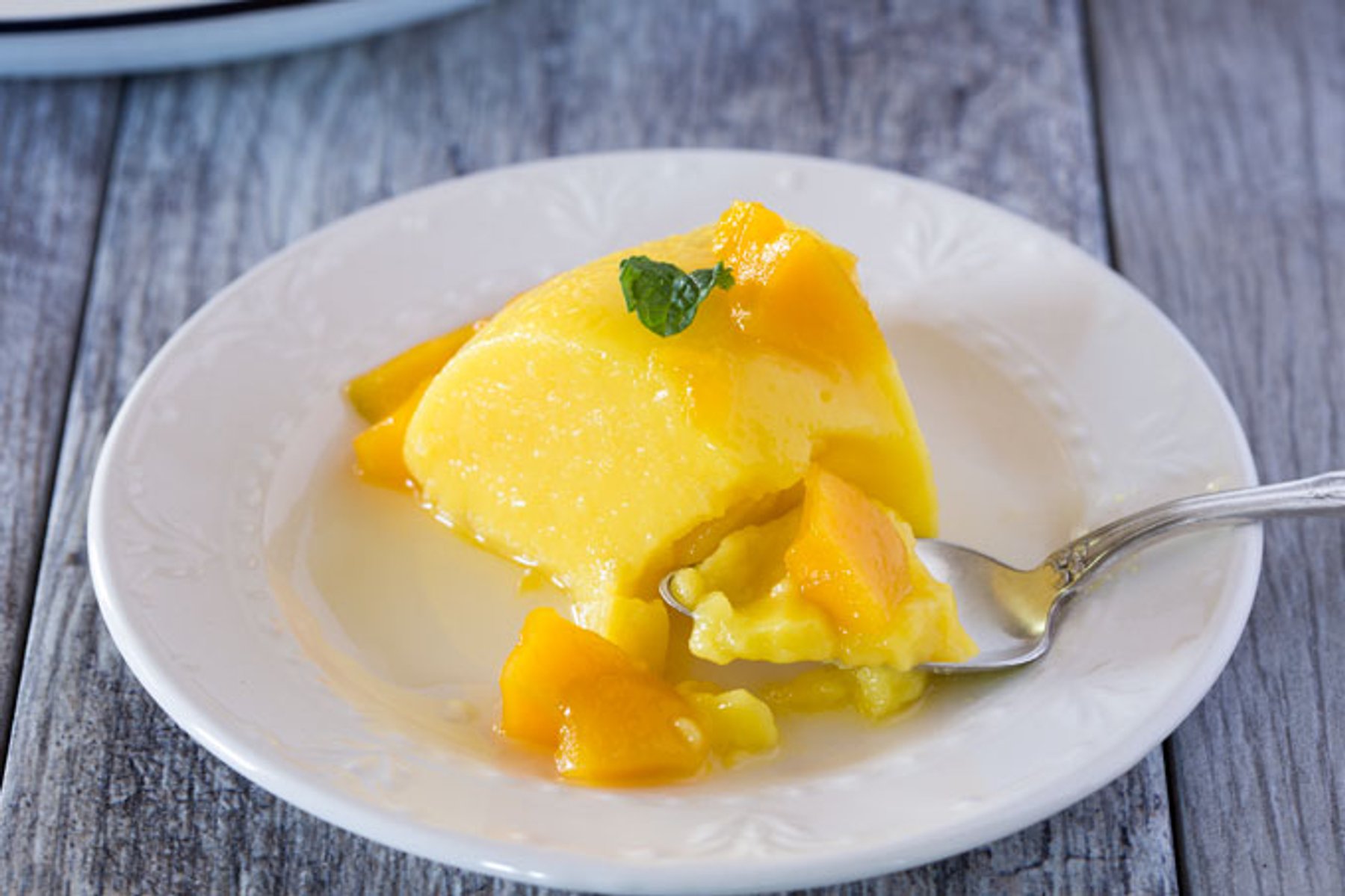 This mango and coconut pudding is a cool, tasty, and very original way to fight the summer heat while indulging your sweet tooth. And it is beautifully finished with a lovely mango syrup with fruit.