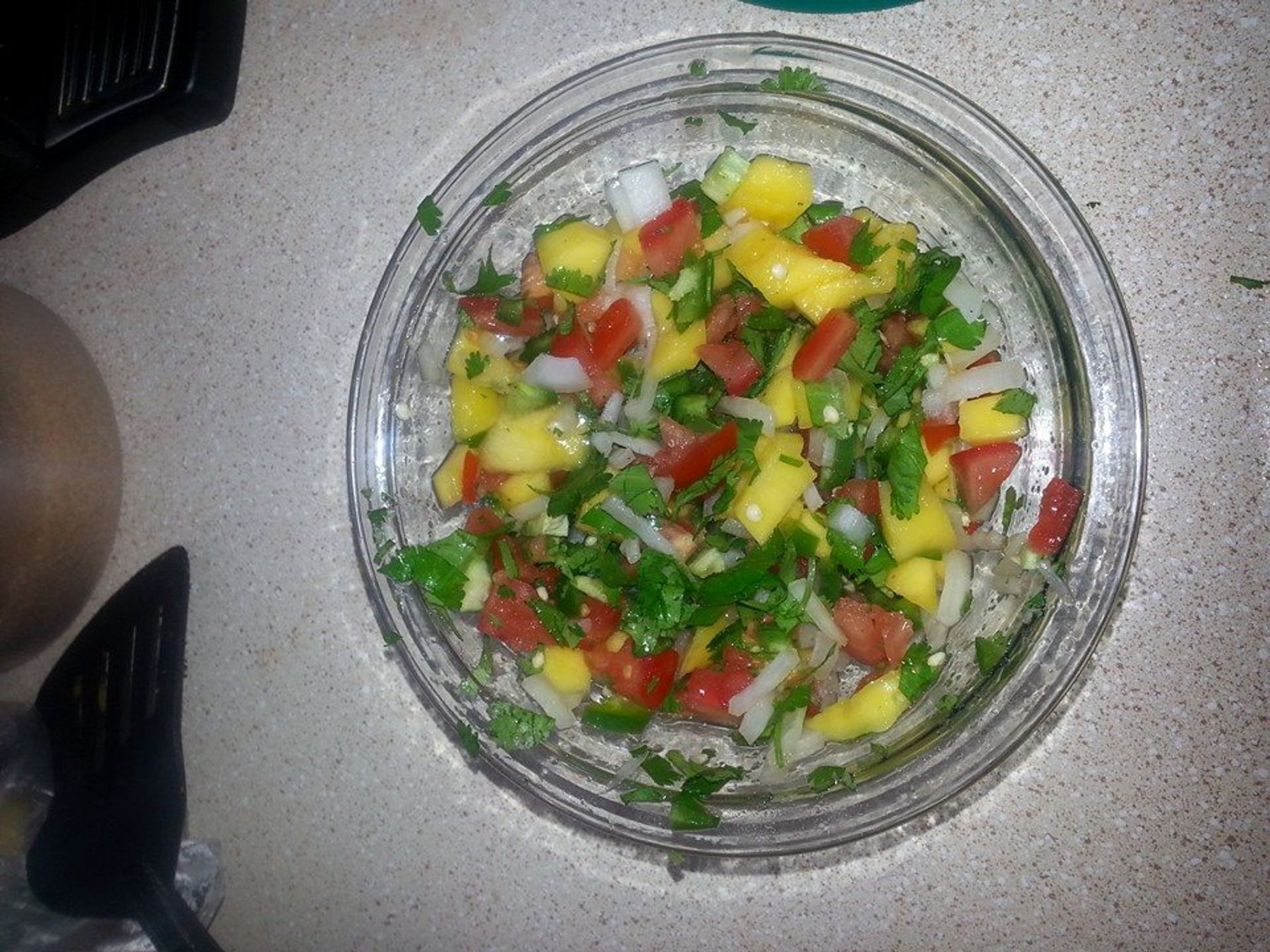Dice tomatoes, onion, peppers, avocado, and mango and Put in bowl. Finely cut cilantro and add (I use 1/2-1 cup). Sprinkle lime juice as needed. Serve with Tortilla chips or it is also great with white fish or chicken.
