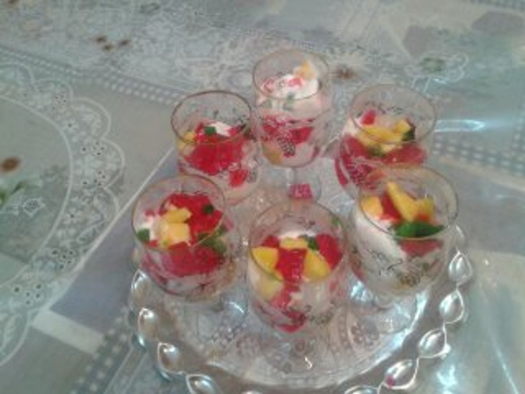 In each serving glass, pour chilled jelly cubes, then 1 vanilla icecream scoop then some mango cubes then again 1 more icecream scoop n again put some more jelly cubes. Garnish with nuts n soft candies. Serve chilled and Enjoy !!!!