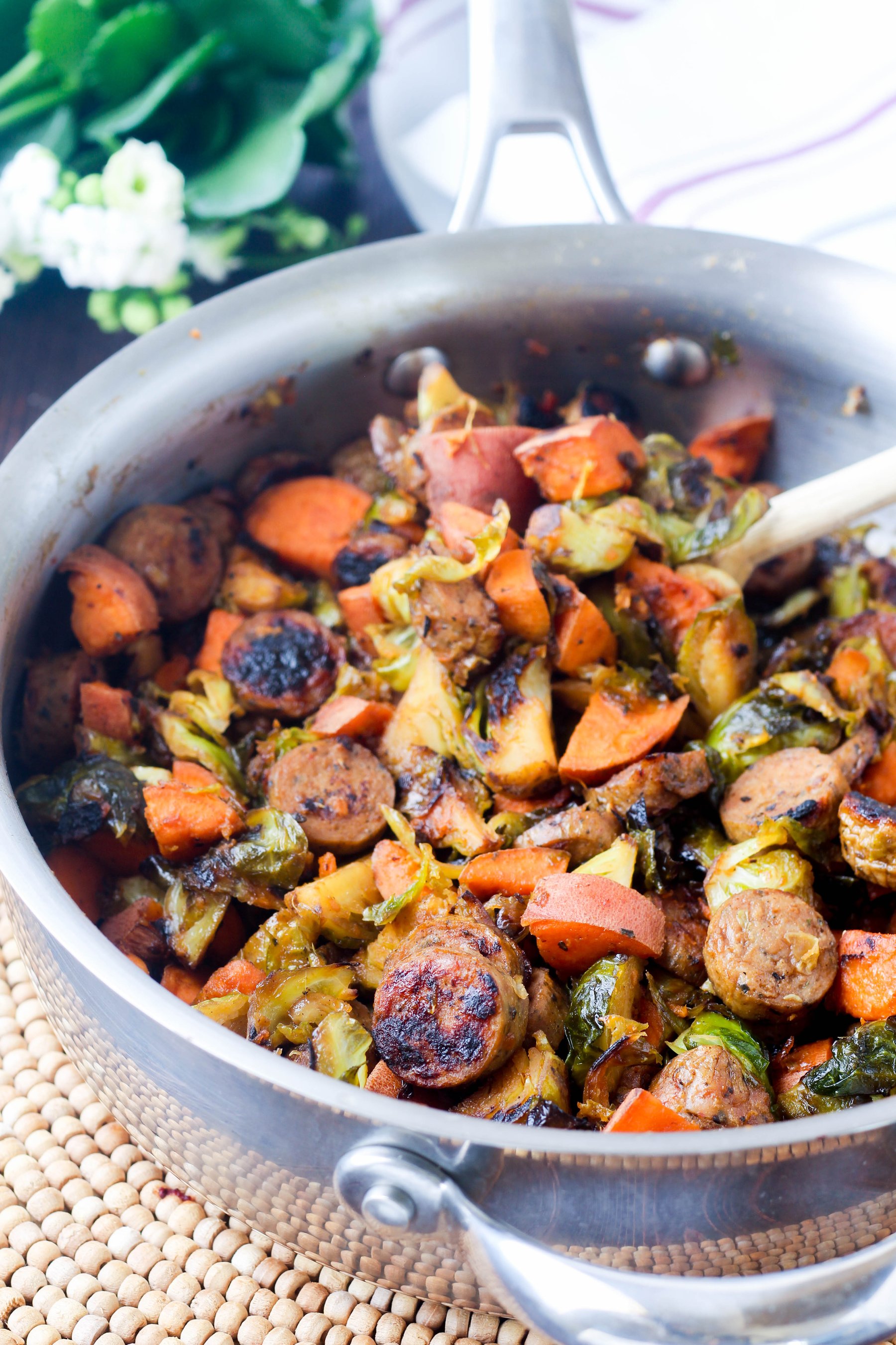 Chicken Sausage Skillet with sweet potatoes and brussels sprouts cooked in a sweet and savory maple glaze that will have you licking your fingers, spoons, and plates. No judgment. (Gluten Free, Paleo)