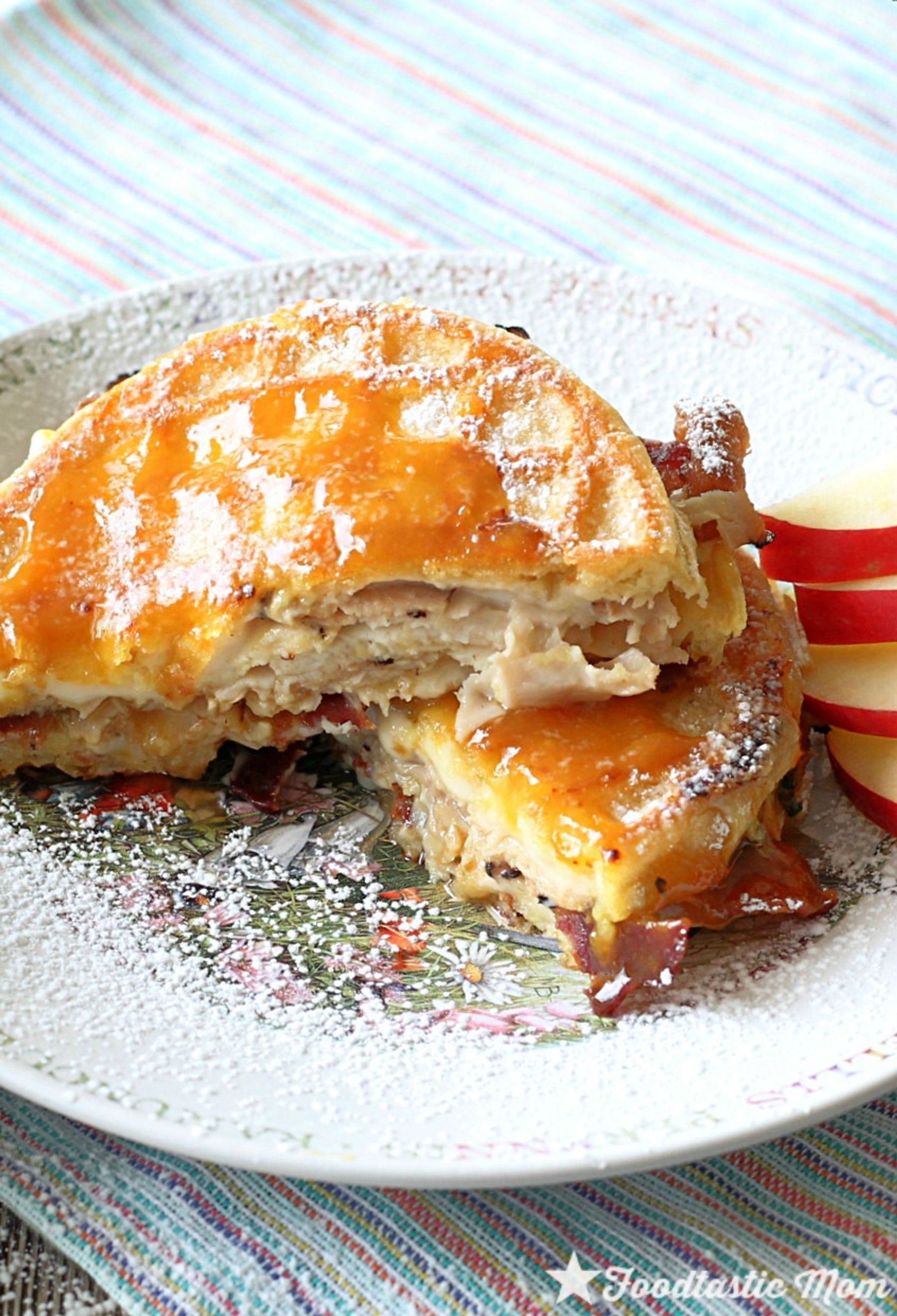 My version of a monte cristo grills maple-roasted deli chicken, bacon, sharp American cheese and an apricot spread between two waffles.