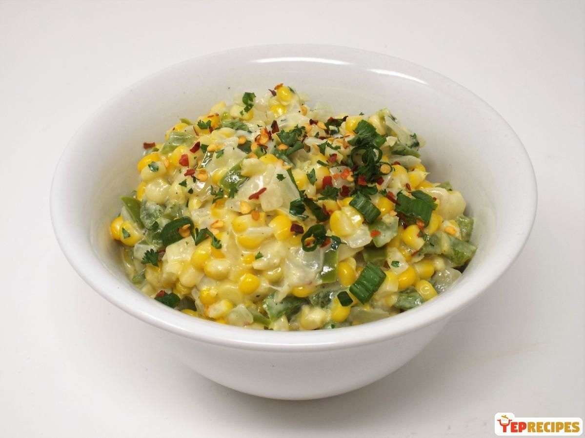 A traditional side dish of Louisiana consisting of corn, green pepper, onion, and garlic sauteed in butter and finished with heavy cream.