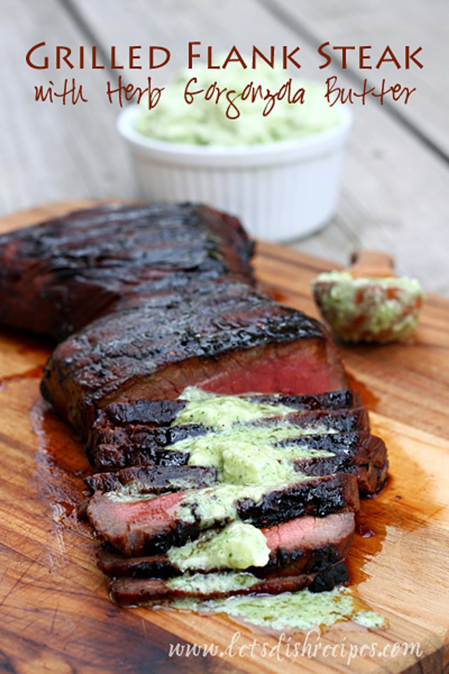 Grilled flank steak topped with a delicious herb and Gorgonzola cheese butter.