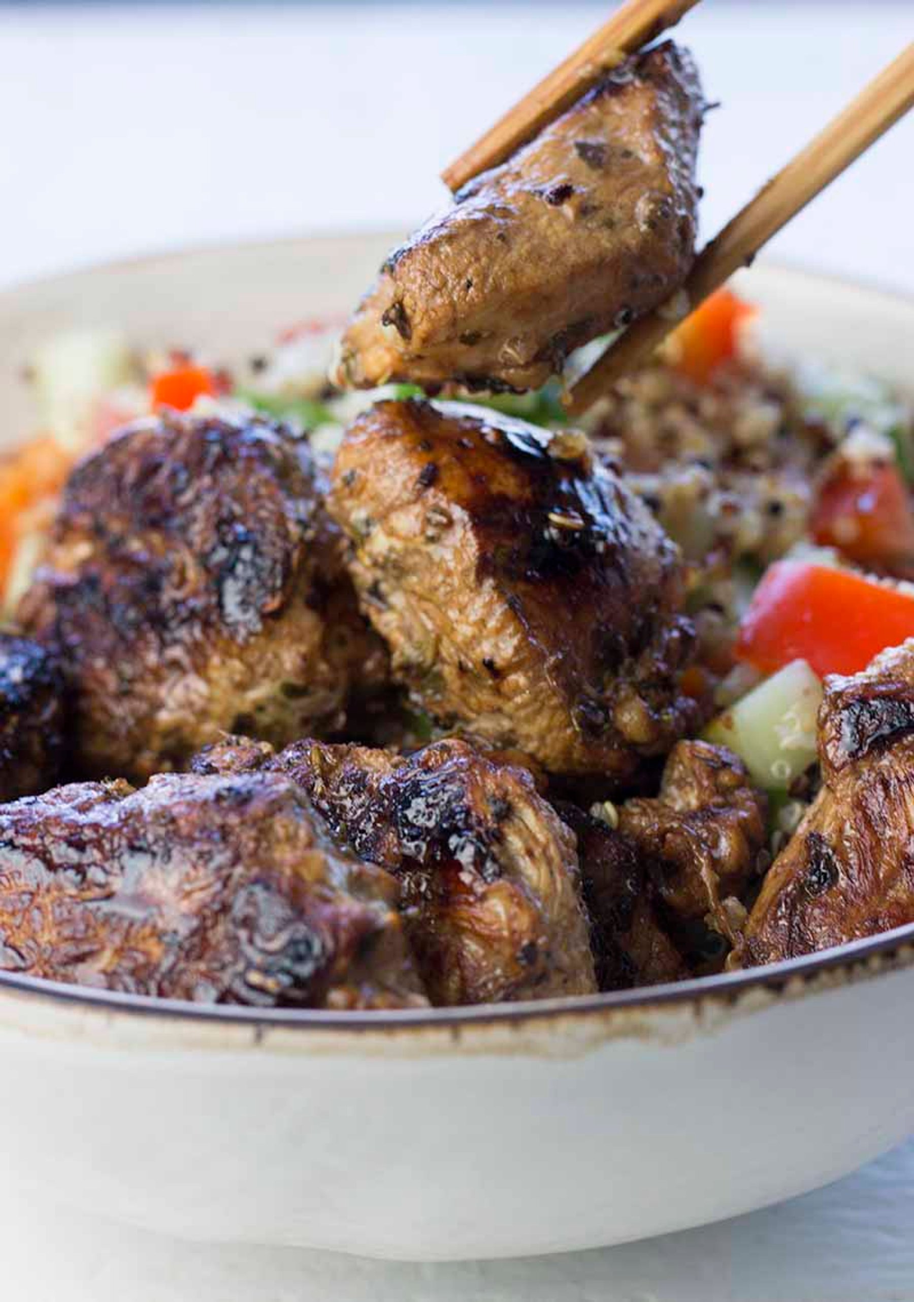 1. Mix basil, thyme, garlic powder, salt and pepper with balsamic vinegar and olive oil in a bowl or large Ziploc