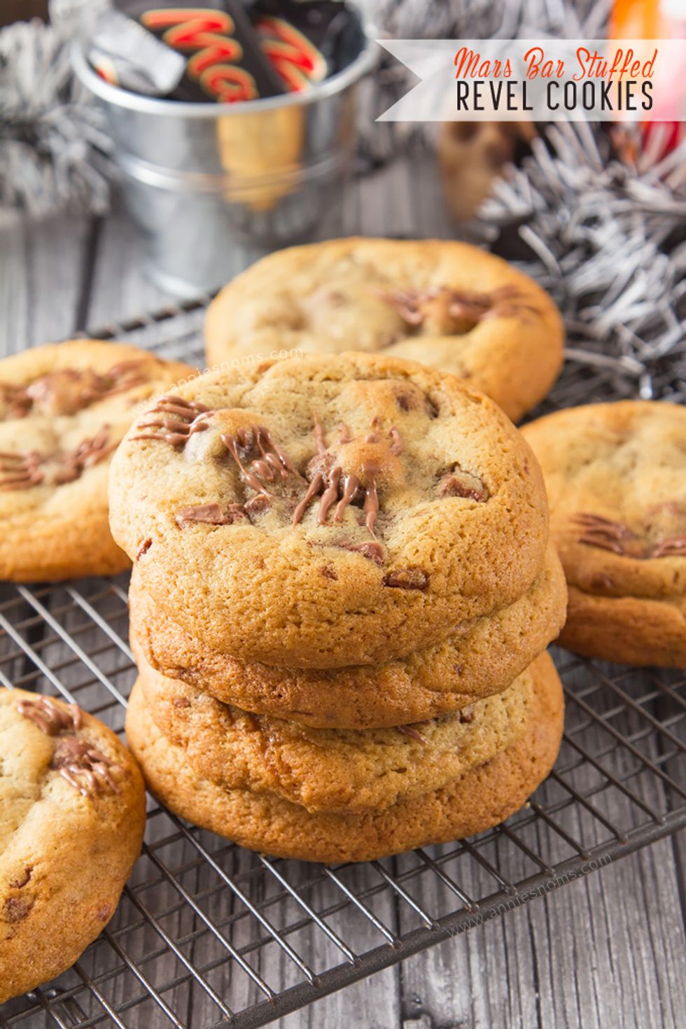 Thick, chewy cookies filled with all the flavours of Revels, stuffed with a big chunk of Mars Bar and finished off with piped spiders legs!