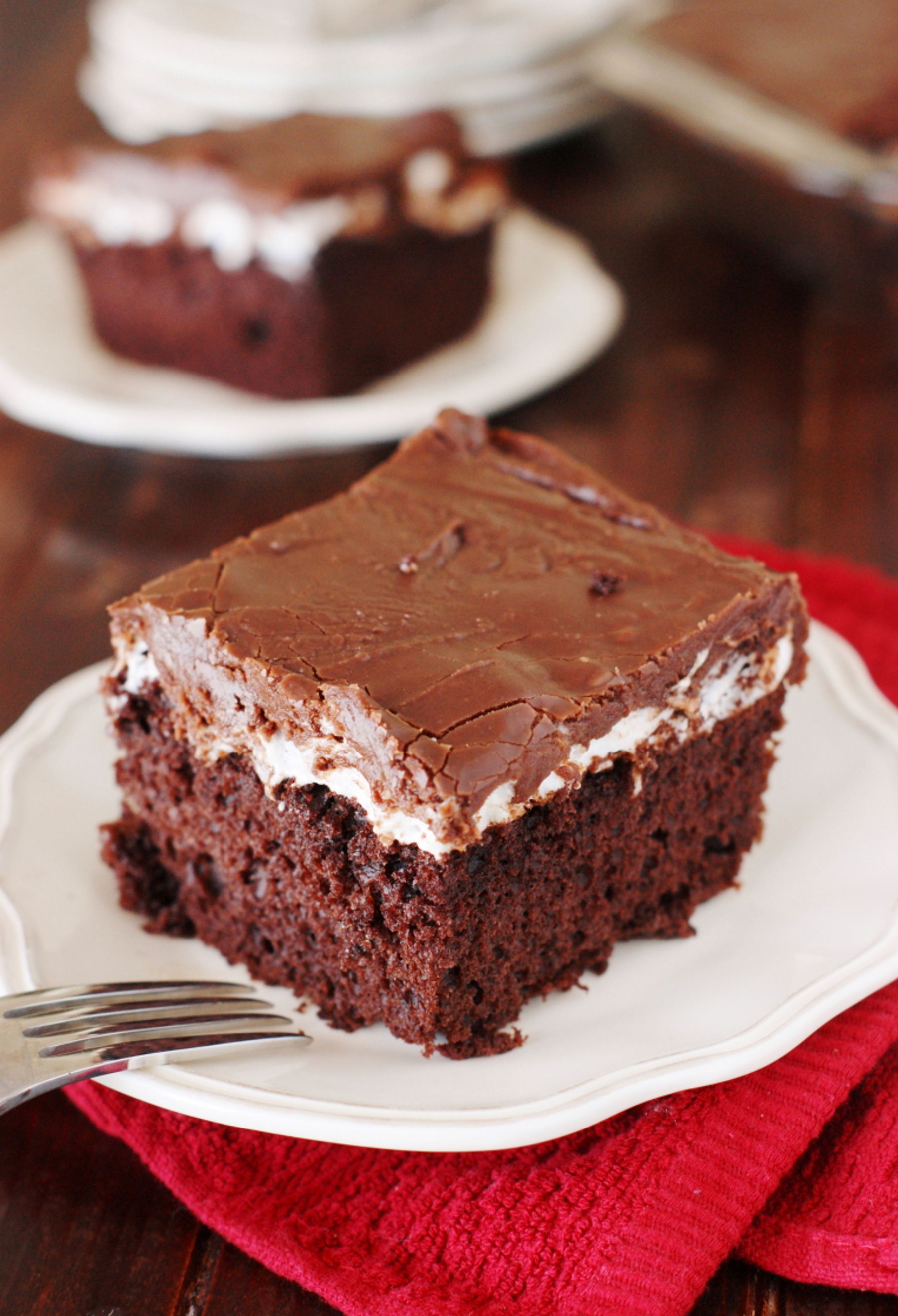 Tender-and-tasty chocolate cake topped with a layer of gooey, melty marshmallow and rich chocolaty-fudgy icing. It\\\\\\\'s pure chocolate deliciousness!
