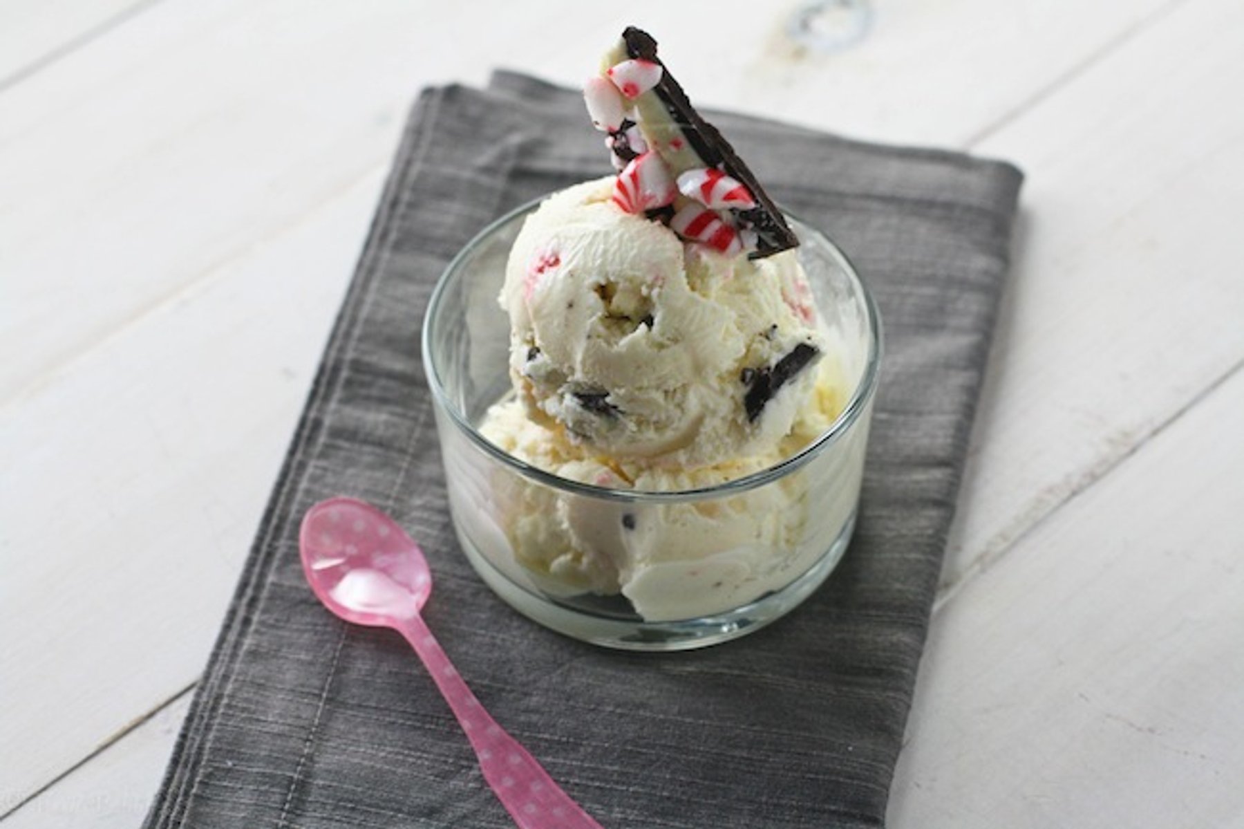 Smooth, creamy marshmallow ice cream with homemade peppermint bark pieces scattered throughout.