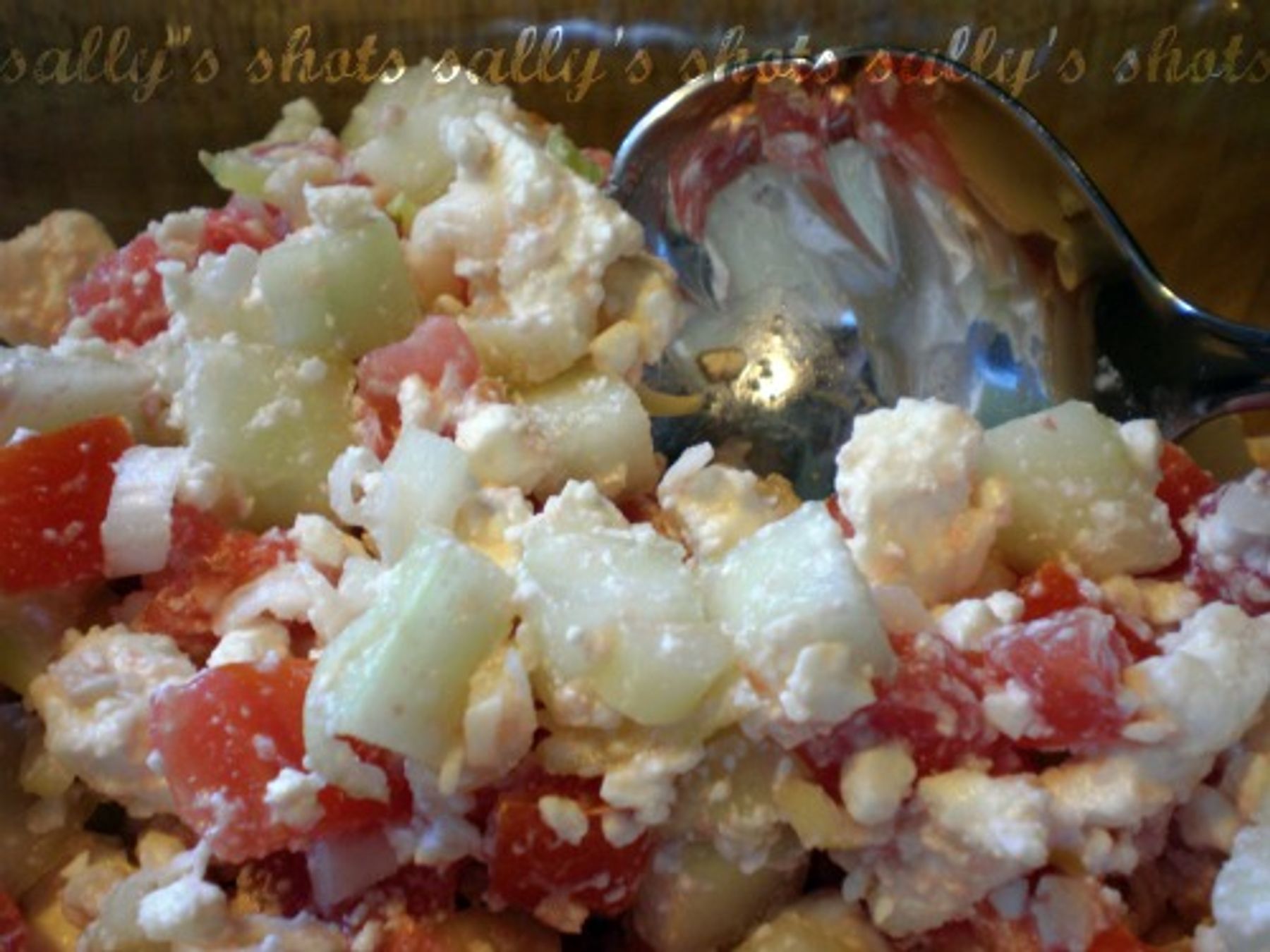 Tomatoes, cucumbers, green onion, feta cheese, and garlic -- what a flavorful combination!