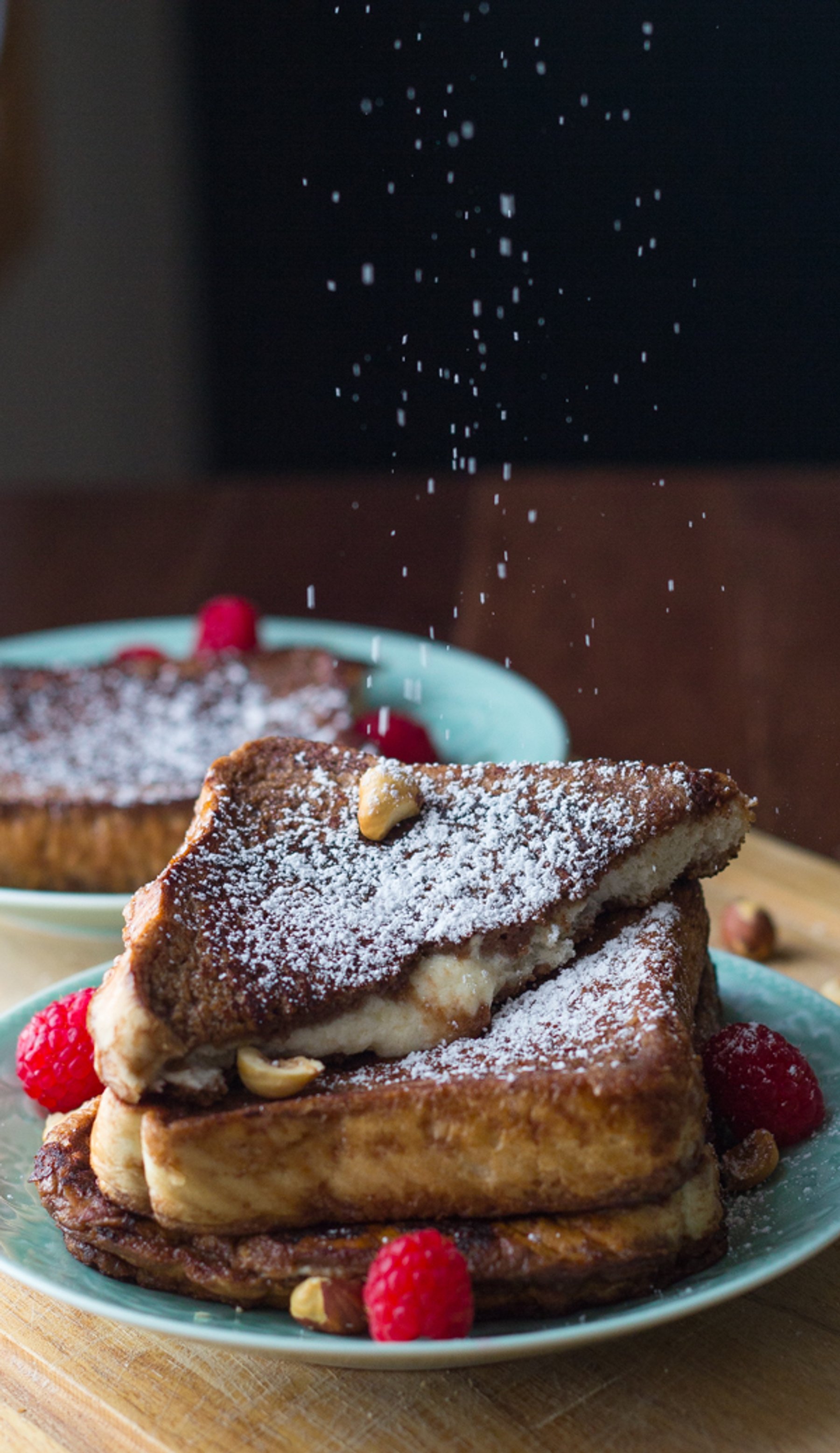 Chocolate espresso french toast is stuffed with creamy mascarpone cheese in this decadent and deceptively easy breakfast! Serve with fresh raspberries and toasted hazelnuts.