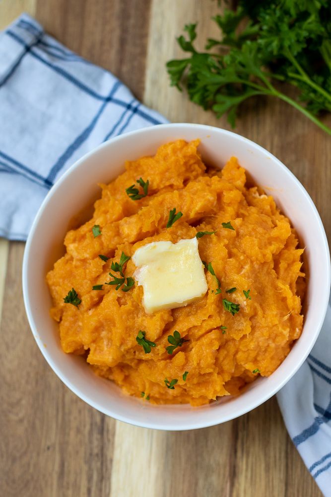 Mashed Sweet Potatoes are an easy and healthy side dish that are perfect for a weeknight meal or holiday meal. These savory sweet potatoes are made with a few simple ingredients and ready in less than 30 minutes.