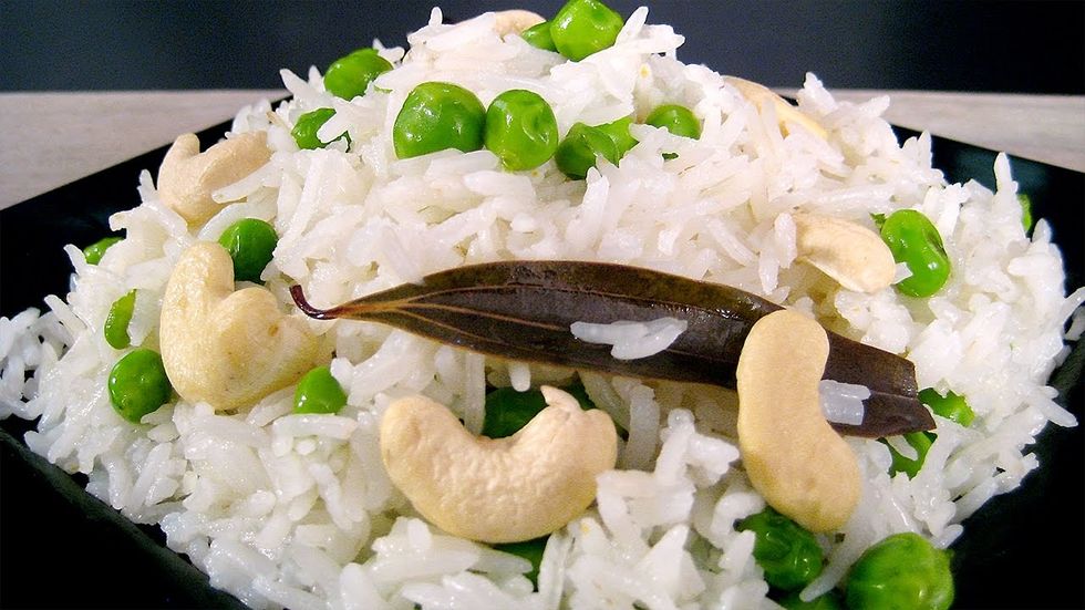 Add the peas, garam masala, salt, turmeric and rice and stir well.