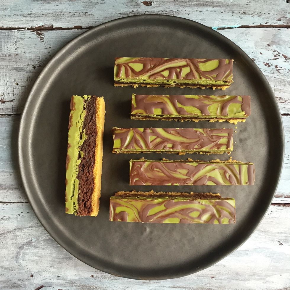 Matcha Brownie Sticks with a Cereal & Tahini Crust