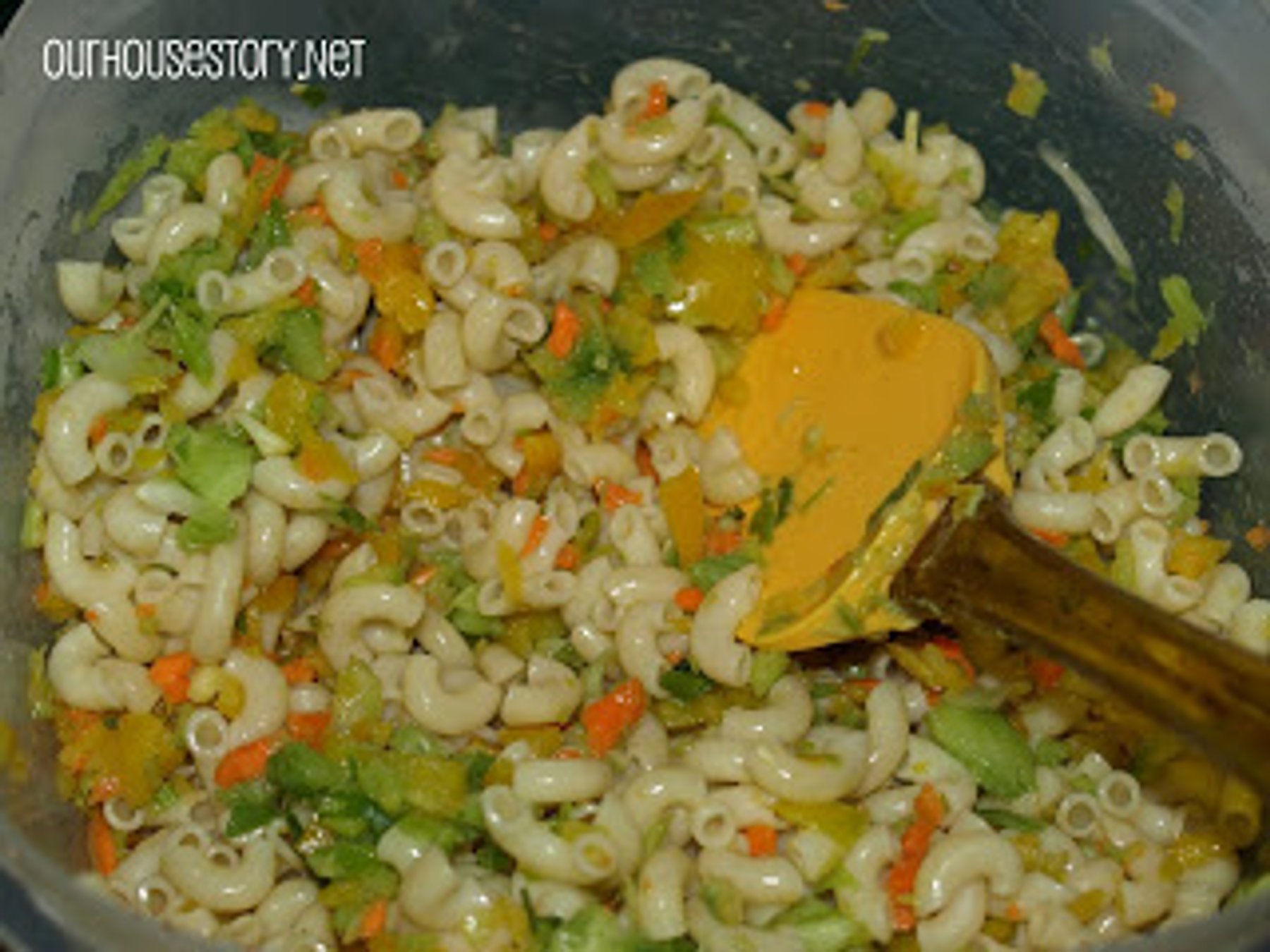 Throw all your vegetables into a food processor and chop until you have small pieces. Next, in a medium bowl mix the avocado mayo, vegetables and macaroni together. ( I started with 1/3C of the avocado mayo...